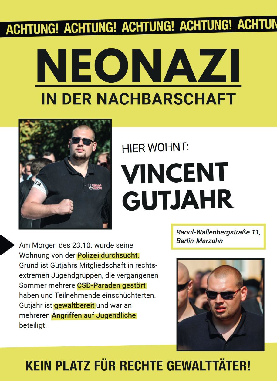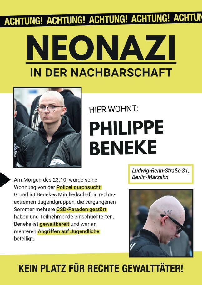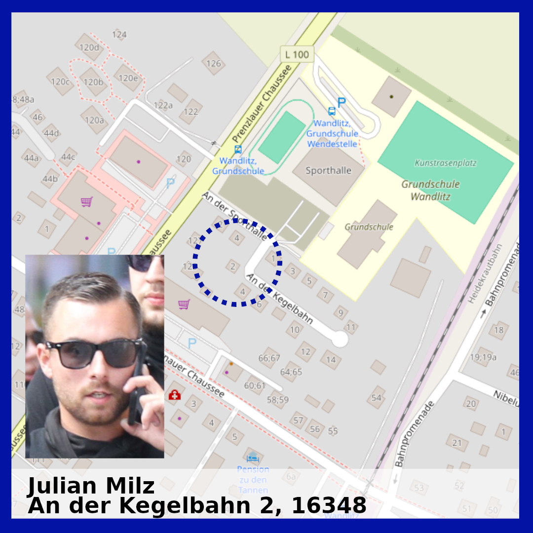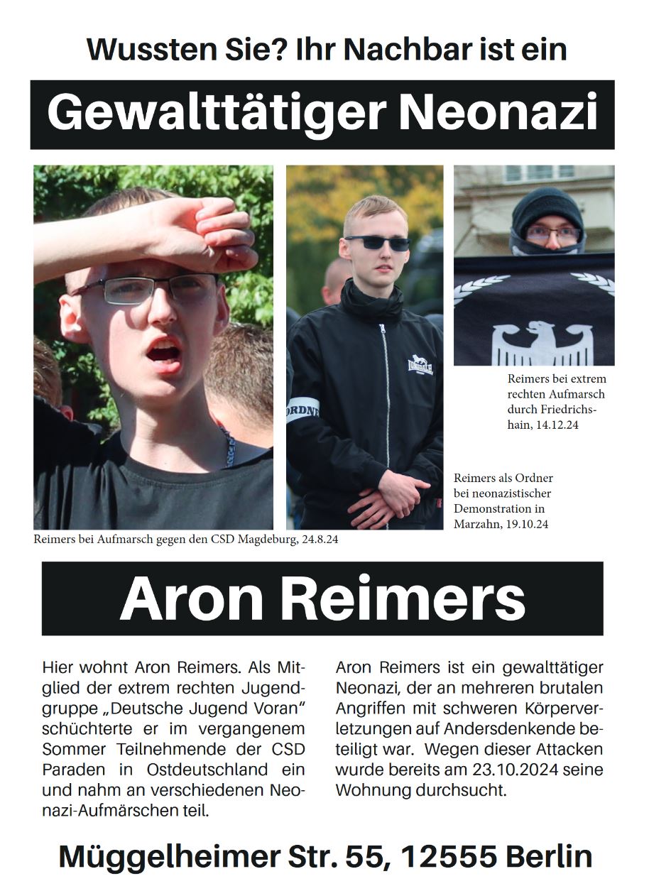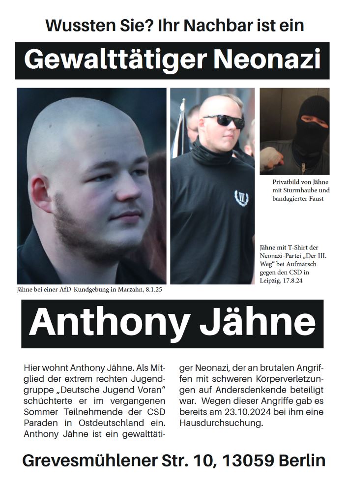 Bereits im Dezember 2024 gab es Outings an Wohnorten Berliner Nazis von DJV und „Jung&Stark“, nämlich bei Christopher Wetzels in der Max-Herrmann-Straße 4 in Marzahn, Vincent Gutjahr in der Raoul-Wallenberg-Straße 11 in Marzahn, Carsten Grasse in der Welsestraße 2 in Lichtenberg, Philippe Beneke in der Ludwig-Renn-Straße 31 in Marzahn und den Berliner DJV-Anführer Julian Milz bei seinen Eltern im brandenburgischen Wandlitz An der Kegelbahn 2. -