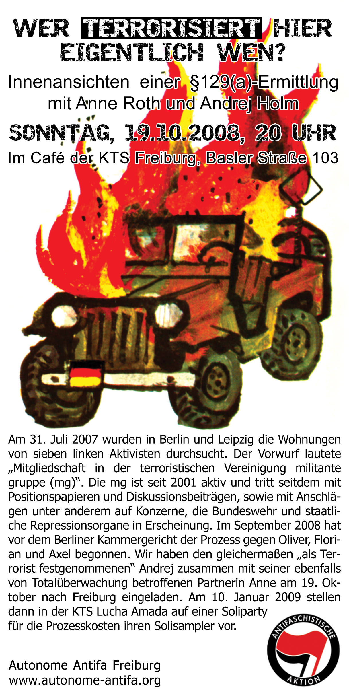 Seit Jahren fahren Bundesanwaltschaft und Ermittlungsbehörden ganz große Geschütze auf, wenn es darum geht, linke Bewegungen zu kriminalisieren. Ob Hausdurchsuchungen vor dem G8-Gipfel, Große Lauschangriffe gegen Antifaschisten in Bad Oldesloe oder die Festnahmen gegen mutmaßliche Mitglieder der „militanten gruppe (mg)“ — viele Verfahren gegen linke AktivistInnen wurden mit dem Verdacht der Mitgliedschaft in einer terroristischen Vereinigung nach §129(a) begründet.