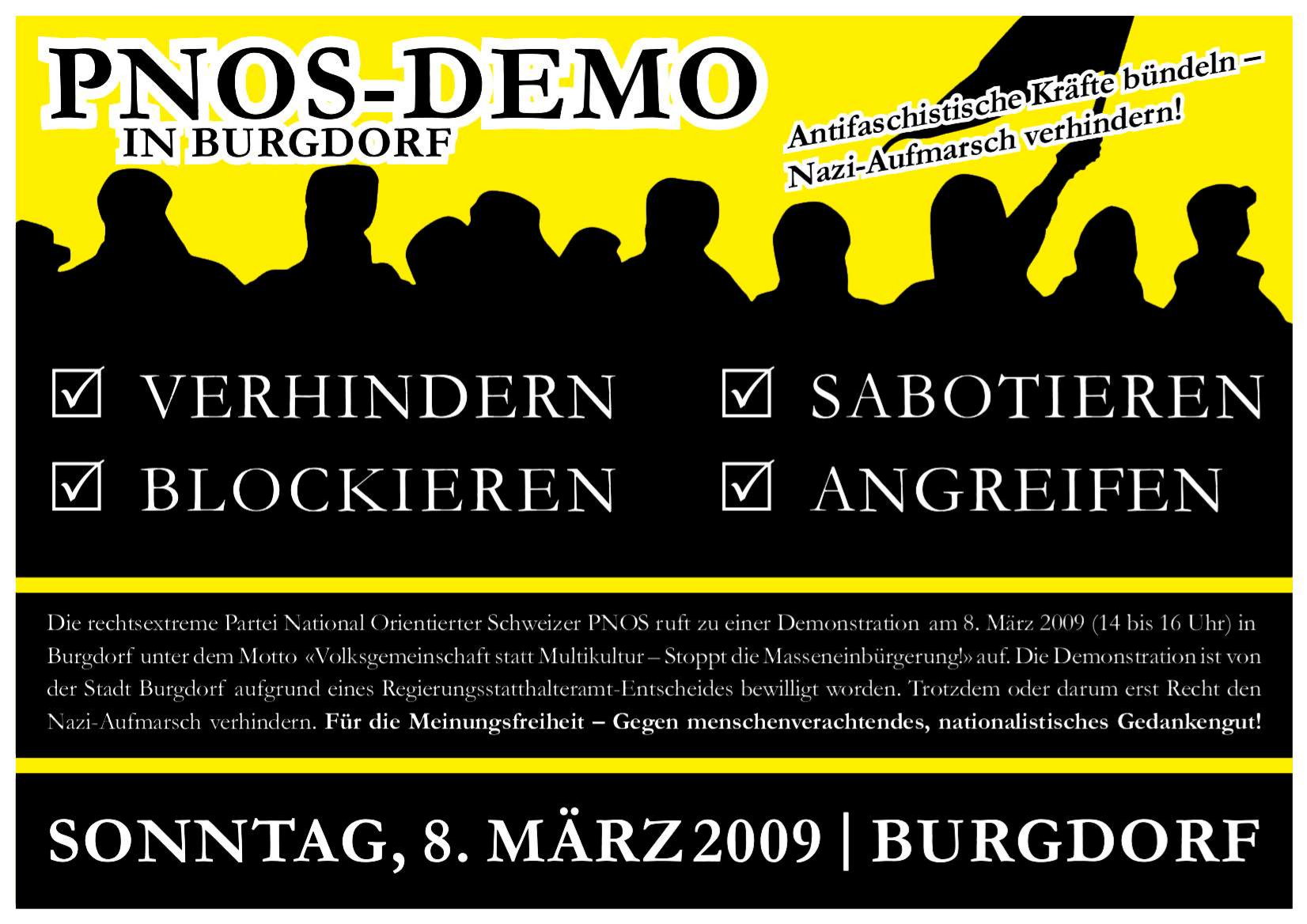 Le 8 mars 2009, un cabinet d’horreur voudrait, avec l’aval des autorités, traverser Berthoud : les néonazis du PSN (Parti des Suisses nationalistes, PNOS en allemand) veulent manifester pour l’abolition d’une norme pénale qu’ils violent régulièrement : la loi antiraciste.
