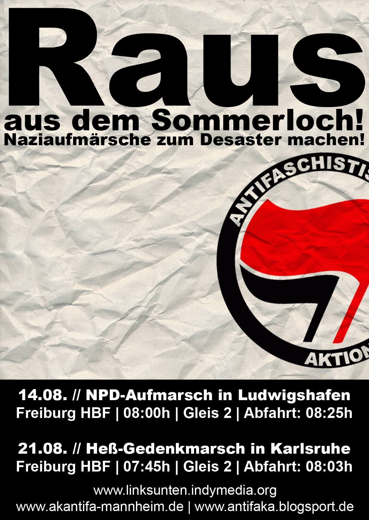 Bereits am 17. August vergangenen Jahres hatte die „Kameradschaft Karlsruhe“ zu einem „Flashmob“ auf dem Marktplatz vor dem Rathaus aufgerufen, der durch antifaschistische Initiative mit Infoständen und einer kurzfristig einberufenen Versammlung verhindert wurde. Trotz einiger Anmeldeversuche in Karlsruhe und Ettlingen ist es Nazis seit 2002 nicht mehr gelungen, durch die Stadt zu marschieren.