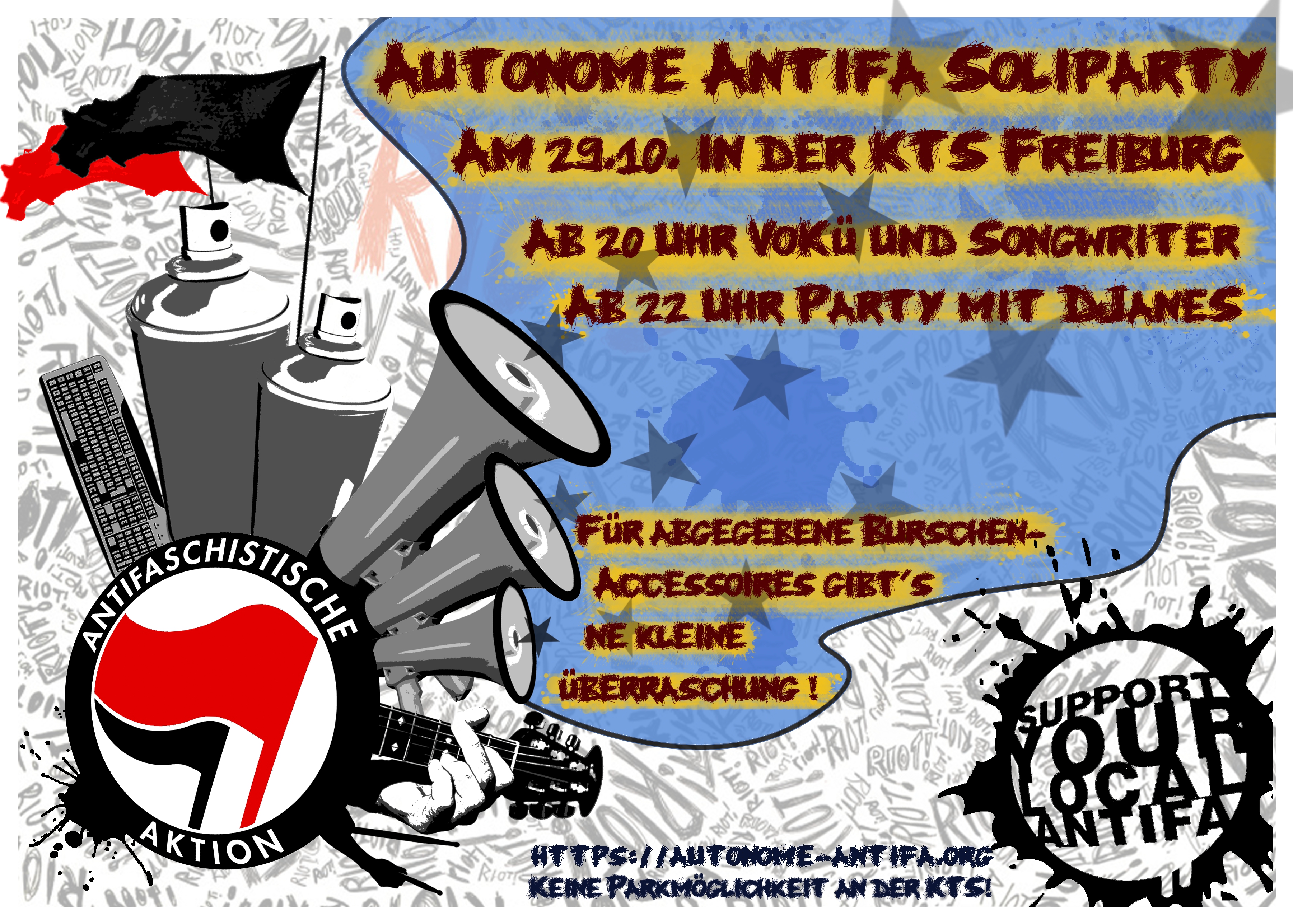 Wie jedes Jahr im Herbst feiern wir unsere Soliparty in den Katakomben der KTS. Am Abend nach der „Wem gehört die Stadt“-Demo, laden wir euch zur legendären Soliparty der Autonomen-Antifa ein.