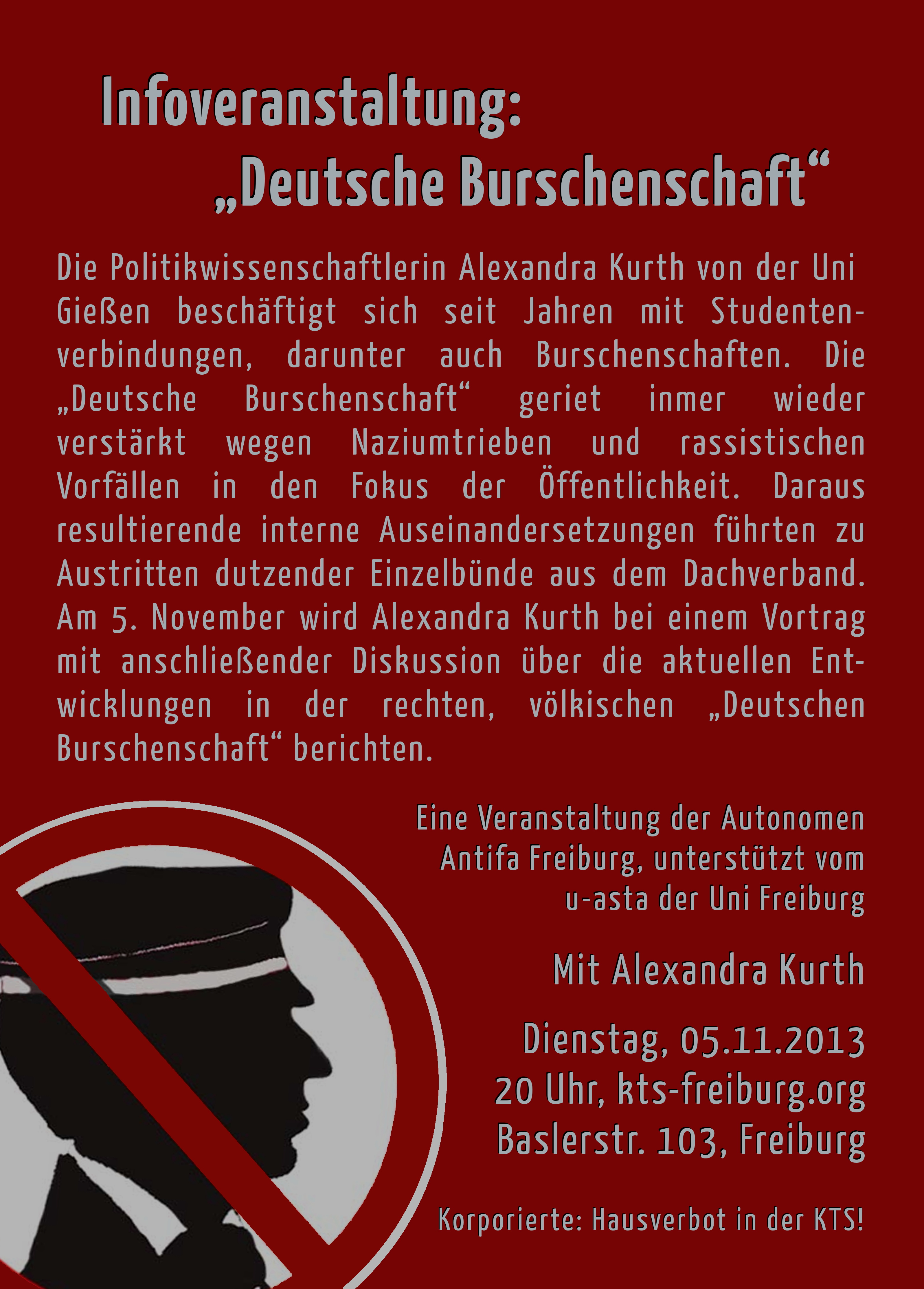 Die Politikwissenschaftlerin Alexandra Kurth von der Uni Gießen beschäftigt sich seit Jahren mit Studentenverbindungen. Am 5. November um 20 Uhr wird sie in der KTS Freiburg einen Überblick über die jüngste Geschichte der Deutschen Burschenschaft geben.