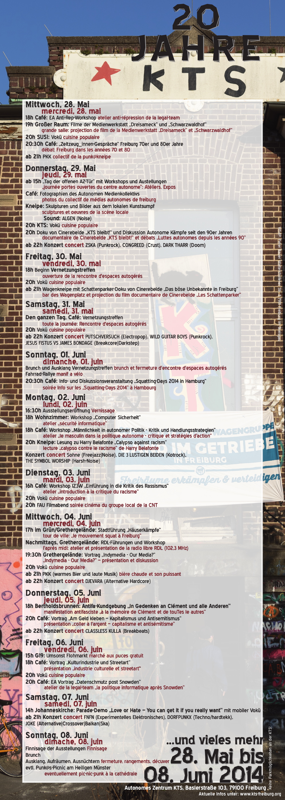 Die KTS hat dieses Jahr Geburtstag und wird 20! Wir laden zur intergalaktischen Versammlung und autonomen Kulturwoche in Freiburg vom 28. Mai bis 8. Juni 2014! Mit einem buntem und voll gepacktem Programm mit Veranstaltungen und Aktionen aus Politik, Musik, Kunst und Kultur möchten wir die letzten 20 Jahre autonomes Zentrum in Freiburg feiern.