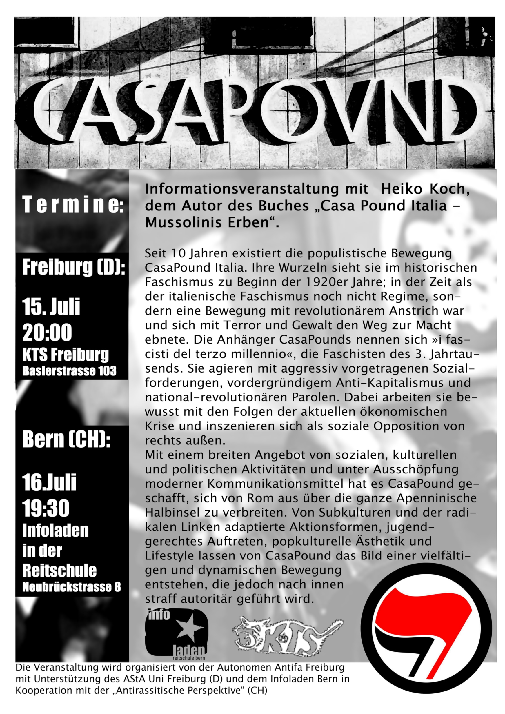 Die Autonome Antifa Freiburg lädt Heiko Koch in die KTS Freiburg ein, Autor des im Oktober 2013 erschienenen Buches „Casa Pound Italia: Mussolinis Erben“. Er wird die faschistische Bewegung „Casa Pound“ in seinem Vortrag vorstellen und die Bezüge nach Deutschland beleuchten.
