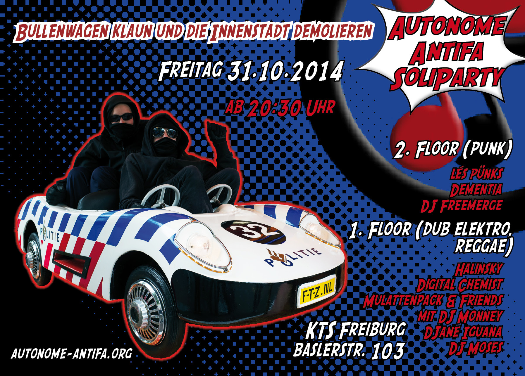 Auch dieses Jahr lädt die Autonome Antifa euch wieder Ende Oktober zur Soliparty in die KTS ein. Ab 20:30 Uhr gibt’s zur Stärkung für den Abend saisonal-regionale VoKü aus der neuen KTS-Küche. Musikalisch hat der Abend einiges zu bieten: 5 Live-Acts mit leicht frankophilem Einschlag von Punkrock bis Broken-Dub, Electro und Artverwandtes.