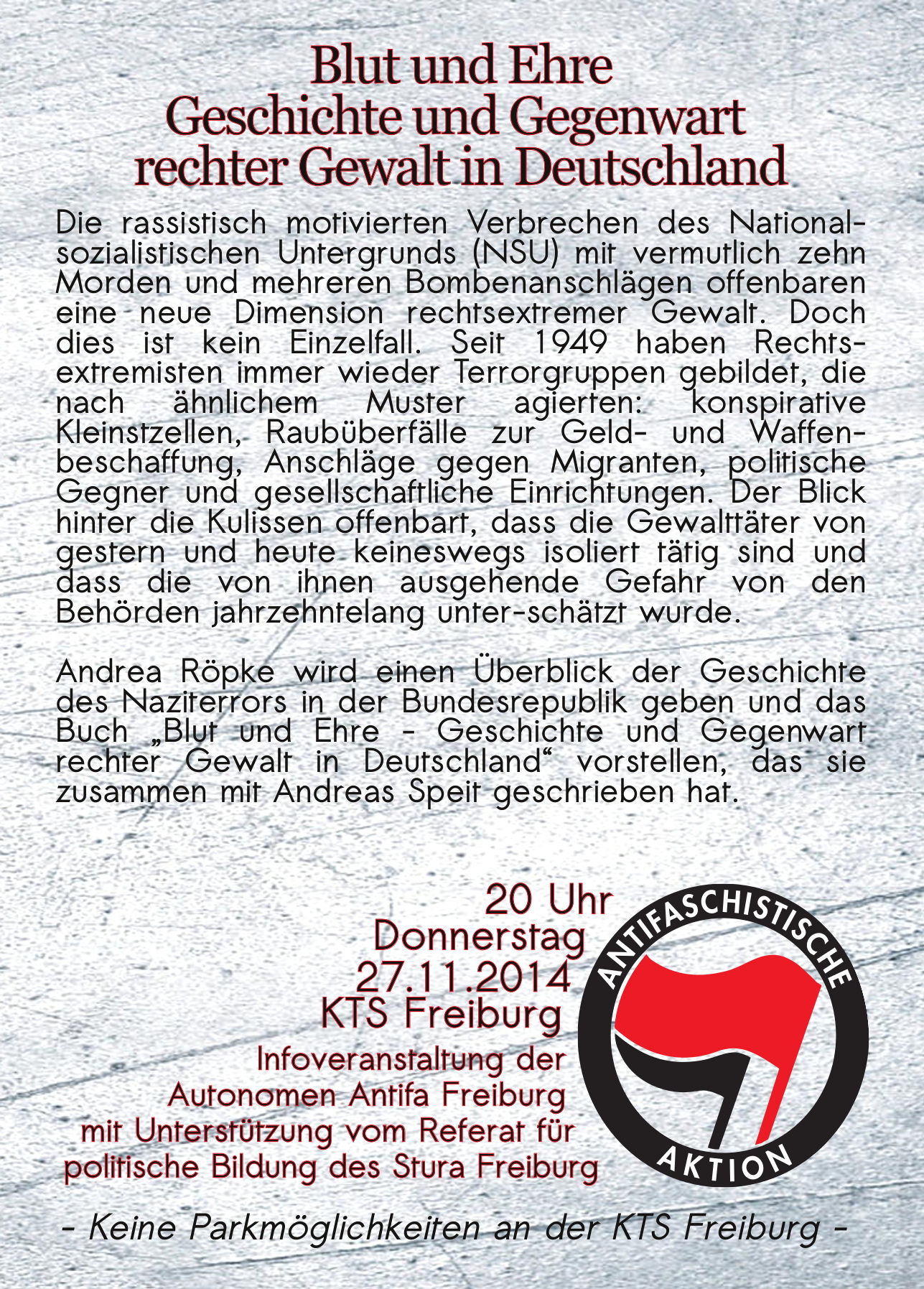 Andrea Röpke wird einen Überblick der Geschichte des Nazizterrors in der Bundesrepublik geben und das Buch „Blut und Ehre - Geschichte und Gegenwart rechter Gewalt in Deutschland“ vorstellen, das sie zusammen mit Andreas Speit geschrieben hat.