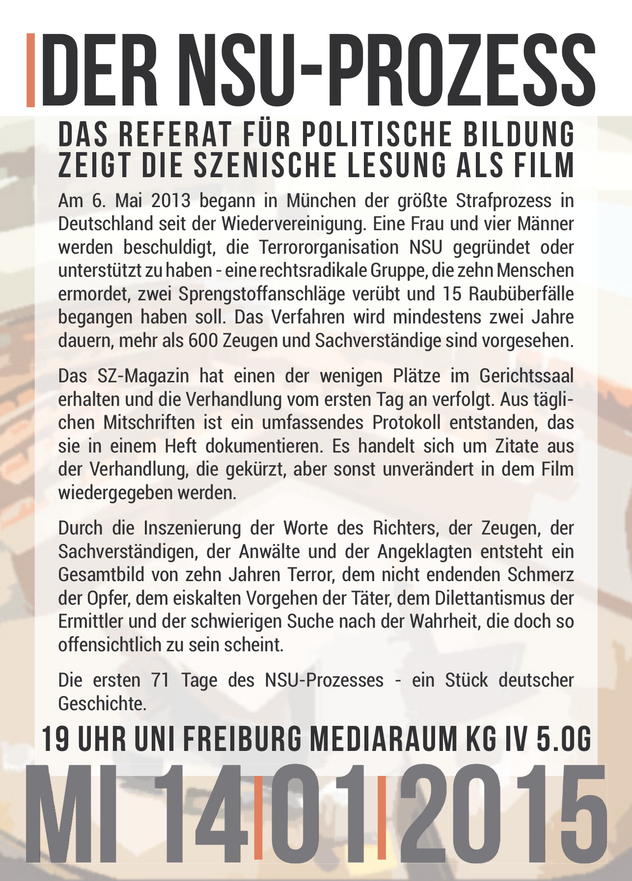 Am Mittwoch, den 14. Januar, zeigt das Referat für Politische Bildung um 19 Uhr im Medienraum der Uni Freiburg, KG IV, 5. OG: „Der NSU-Prozess – Die szenische Lesung als Film“