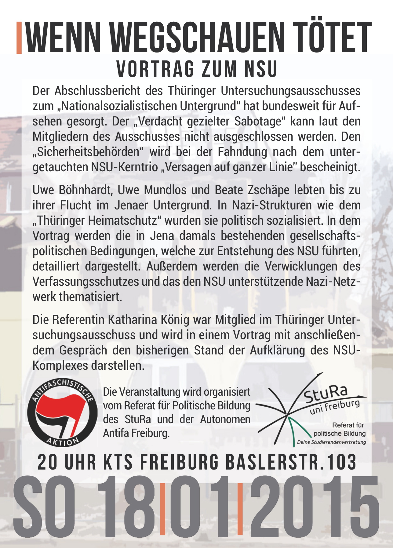 Die Veranstaltung wird organisiert vom Referat für Politische Bildung des StuRa Freiburg und der Autonomen Antifa Freiburg.