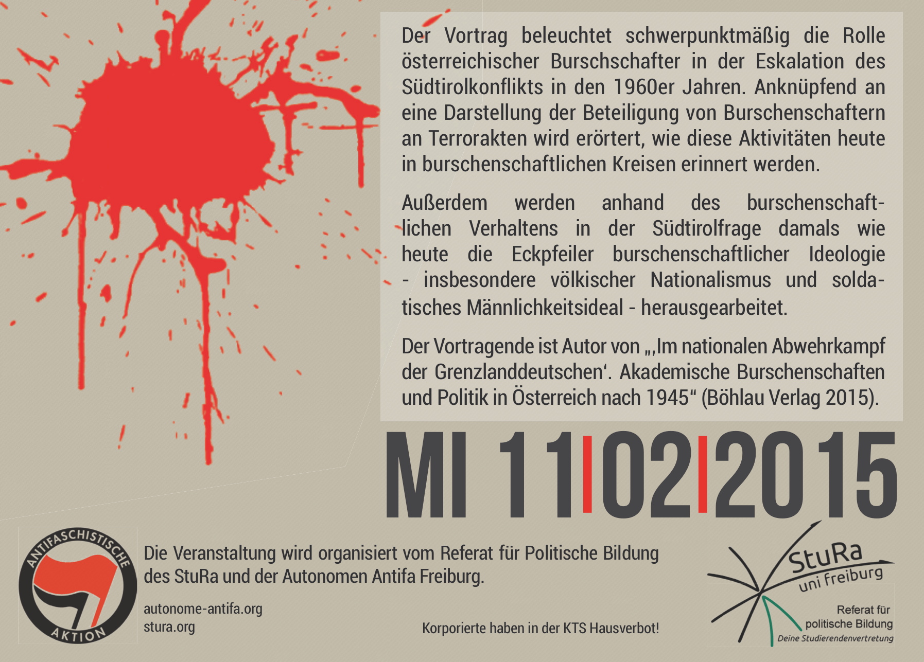 Der Vortrag beleuchtet schwerpunktmäßig die Rolle österreichischer Burschenschafter in der Eskalation des Südtirolkonflikts in den 1960er Jahren. Anknüpfend an eine Darstellung der Beteiligung von Burschenschaftern an Terrorakten wird erörtert, wie diese Aktivitäten heute in burschenschaftlichen Kreisen erinnert werden. Außerdem werden anhand des burschenschaftlichen Verhaltens in der Südtirolfrage damals wie heute die Eckpfeiler burschenschaftlicher Ideologie – insbesondere völkischer Nationalismus und soldatisches Männlichkeitsideal – herausgearbeitet. Der Vortragende Bernhard Weidinger ist Autor von «Im nationalen Abwehrkampf der Grenzlanddeutschen. Akademische Burschenschaften und Politik in Österreich nach 1945» (Böhlau Verlag 2015). Das Buch gibt es in der PDF-Version zum freien Download.