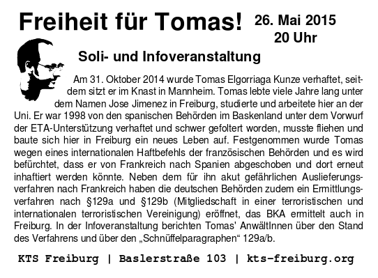 Tomas war 1998 von den spanischen Behörden im Baskenland unter dem Vorwurf der ETA-Unterstützung verhaftet und schwer gefoltert worden. Nach seiner vorübergehenden Freilassung floh er nach Freiburg. Festgenommen wurde er Ende letzten Jahres aufgrund eines internationalen Haftbefehls der französischen Behörden, da er dort in Abwesenheit wegen Passfälschung zu mehreren Jahren Haft verurteilt wurde. Befürchtet wird zudem, dass er nach einer Auslieferung an Frankreich erneut von den spanischen Behörden verhaftet werden könnte.