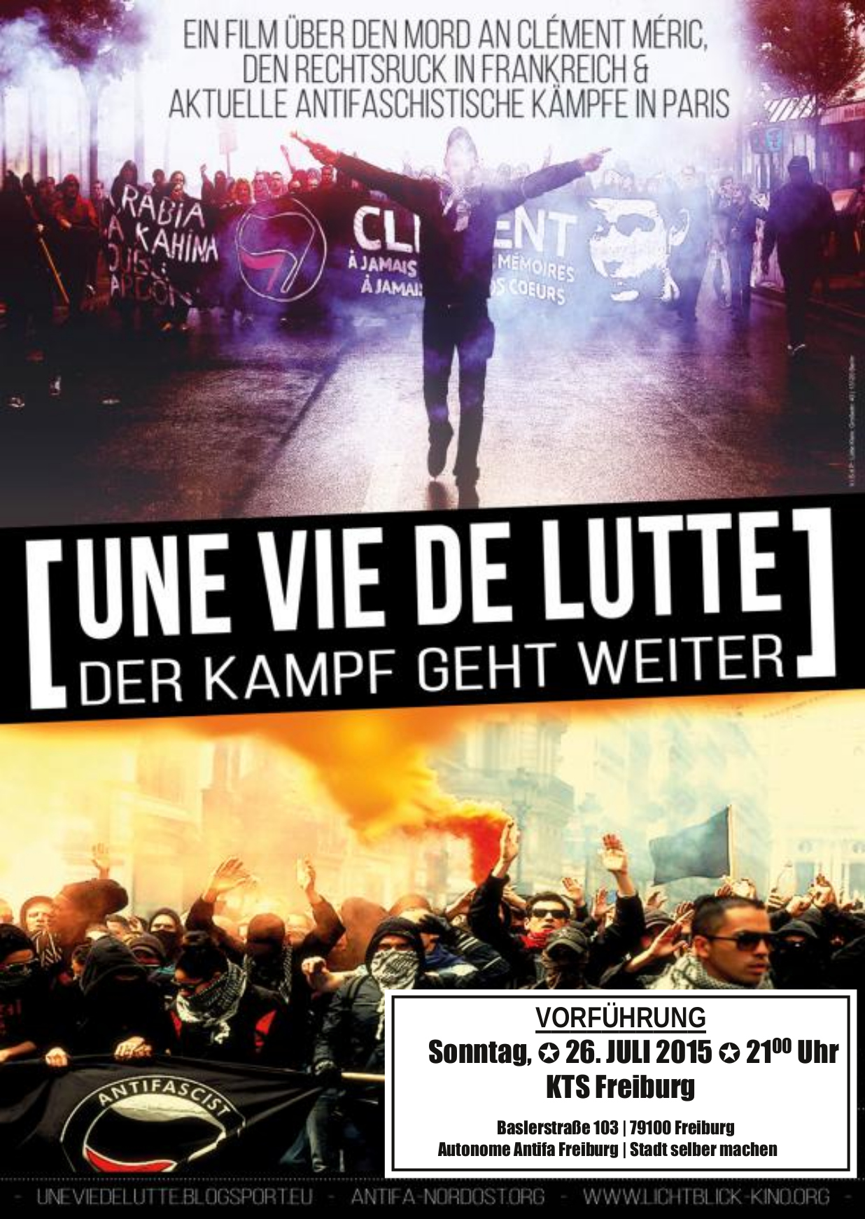Im Rahmen der Kampagne Stadt selber machen zeigen wir am 26. Juli um 21 Uhr in der KTS den Film „Une vie de lutte“. Der Film behandelt den Mord an Clément Méric, der sich Anfang Juni zum zweiten Mal jährte, das Erstarken rechter Kräfte in Frankreich und aktuelle antifaschistische Kämpfe in Paris.
