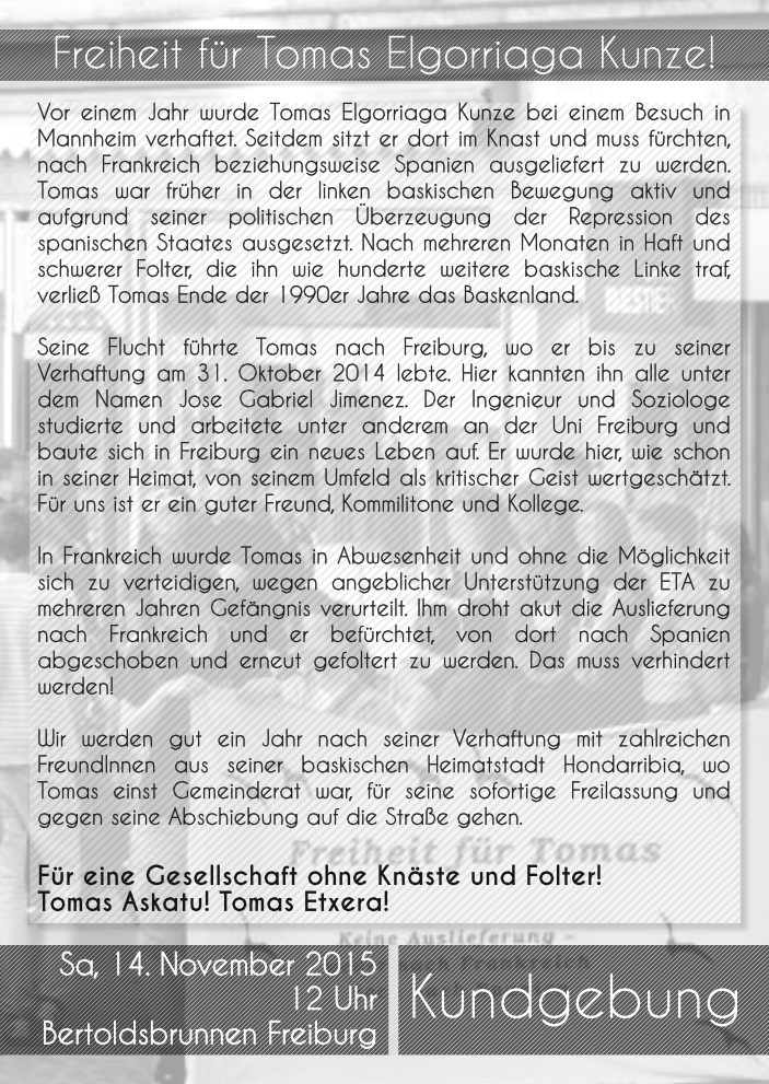 Wir werden gut ein Jahr nach seiner Verhaftung mit zahlreichen FreundInnen aus seiner baskischen Heimatstadt Hondarribia, wo Tomas einst Gemeinderat war, für seine sofortige Freilassung und gegen seine Abschiebung auf die Straße gehen.