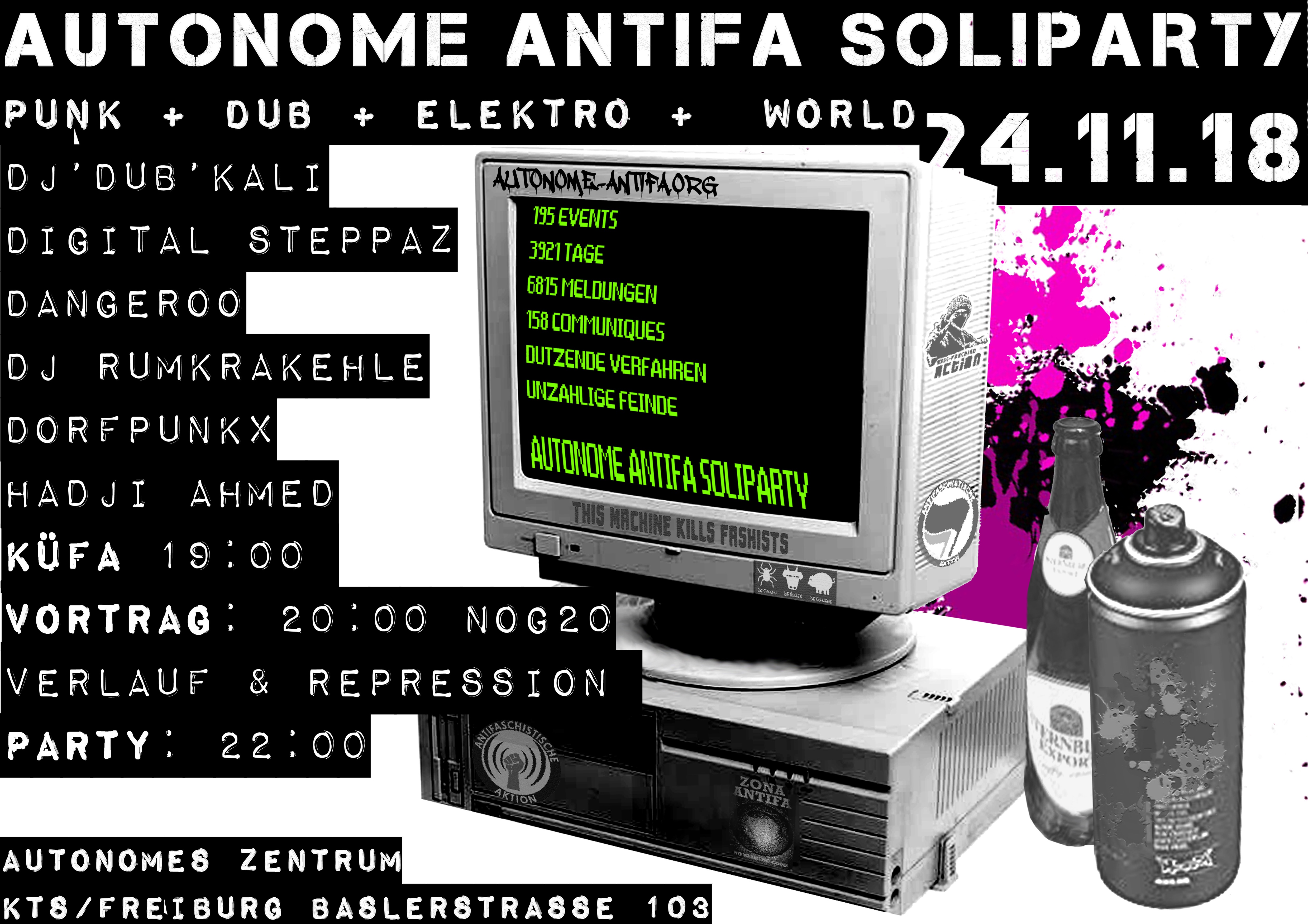 Nach langer Zeit wird’s wieder höchste Zeit das Tanzbein für die Autonome Antifa Freiburg zu schwingen. Hierzu wird auf zwei Floors Punk, Dub, Balkan Beatz und Jazziges präsentiert – vorweg gibt es eine leckere Volxküche mit leckerem kooperativem Gemüse sowie Infos zum vergangenen G20-Gipfel.