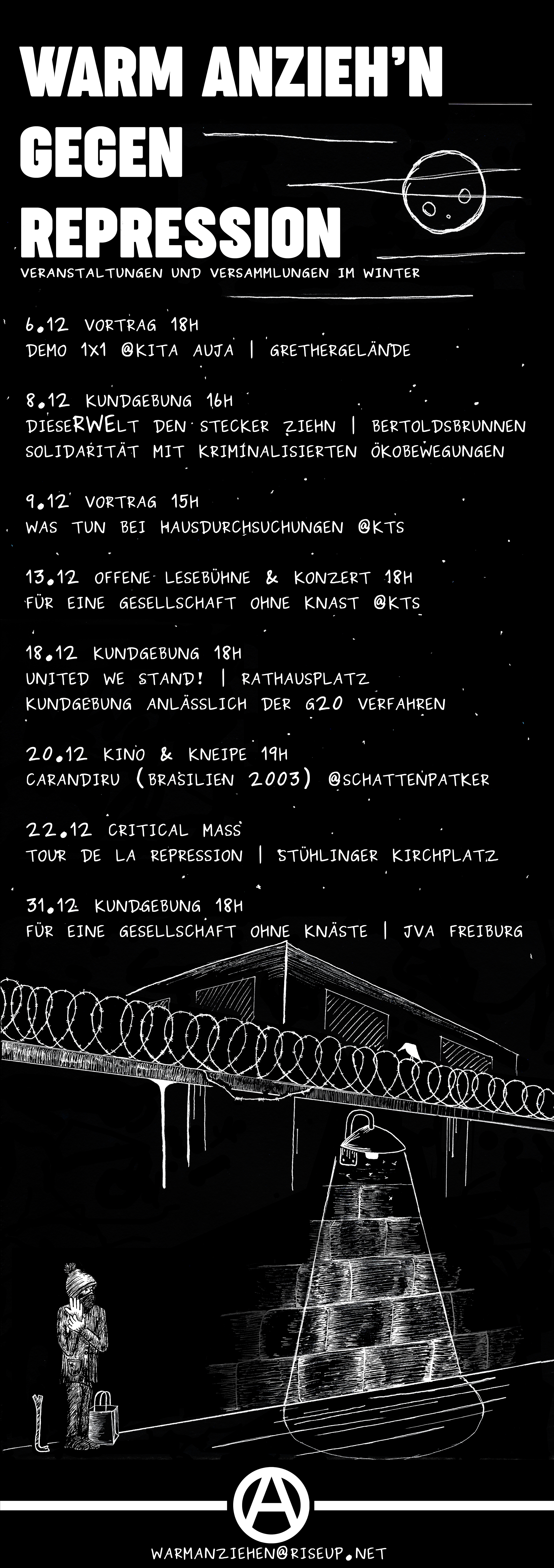 Um den Winter wärmer zu gestalten, organisieren wir inhaltliche Veranstaltungen wie Vorträge und Filme aber auch Versammlungen, Kundgebungen und eine Fahrraddemo statt.