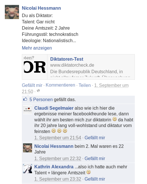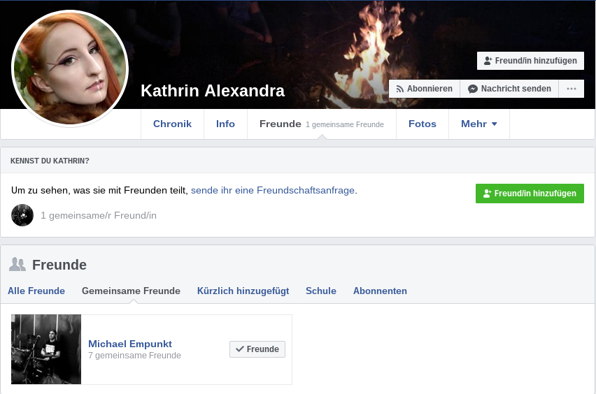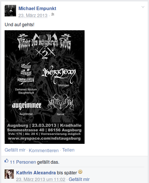 Am 23. März 2013 besuchte Kathrin Kaltenhäuser ein Metalkonzert in Augsburg, wo einer ihrer Nazifreunde, der sich auf Facebook „Michael Empunkt“ nennt und mit dem sie noch immer befreundet ist, mit seiner Band auftrat. Wie unter Freunden üblich, gratulierte sie auch diesem Nazi am 29. August 2013 zum Geburtstag. „Michi“ spielte in mehreren Metalbands und ist Schlagzeuger bei der international bekannten Naziband „Aufbruch“. Zu Kaltenhäusers Naziclique gehörte auch die feierwütige und gut vernetzte Faschistin Manuela Kaiser. Ein weiterer ihrer Nazifreunde war Nicolai Hessmann, der 2011 Schießtrainings in der Schweiz organisierte und im selben Jahr versuchte, einen NPD-Kreisverband Ortenau aufzubauen. Schließlich übernahm er 2016 wenig erfolgreich den NPD-Kreisverband Lörrach-Waldshut. Mit ihm spielte Kaltenhäuser auf Facebook den „Diktatoren-Test“ und neckte ihn anschließend damit, dass sie „mehr Talent“ als er zur Diktatorin habe.