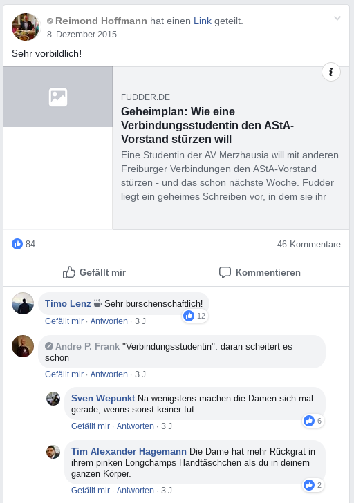Der erste Versuch für Unruhe im StuRa zu sorgen, ging am 24. November 2015 gründlich schief. Marcel Wolle von der „Saxo-Silesia“ teilte in der Facebook-Gruppe „Korporierte in der AfD“ ein Posting der „Jungen Alternative Freiburg/Breisgau-Hochschwarzwald“: „Wir mussten leider draußen beleiben! Gestern am 24.11.2015 fand eine Sitzung des Studierendenrats (StuRa) der Universität Freiburg statt. Unter Top 2 wurde ein Antrag zur Distanzierung von Falsch Verbunden behandelt.“ Dubravko Mandic, der ehemalige Vorzeigenazi der „Burschenschaft Saxo-Silesia“, kommentierte die Sitzung, bei der die Öffentlichkeit vom StuRa ausgeschlossen wurde: „Ich war auch anwesend. Außer mir und einigen Bundesbrüdern und 3-4 Damen von Merzhausia waren so gut wie keine Korpos da, auch nicht die Neupreußen, die es ja primär angeht. Heute bekam ich gleich einen Anruf von einem BZ-Redakteur, der mich während der Versammlung erkannt hatte. Er wollte wissen wieso ich da war.“