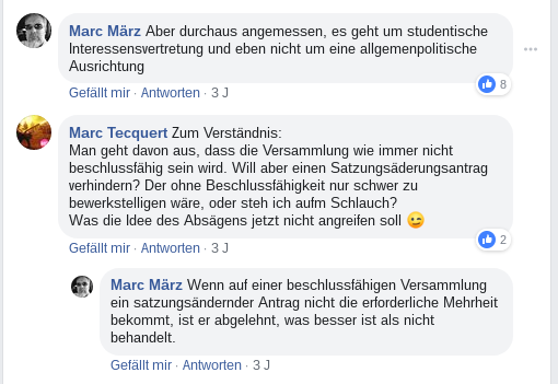 Zakholy warnte vor einem drohenden Linksruck der Verfassten Studierendenschaft: „In dieser Vollversammlung soll über eine Satzungsänderung abgestimmt werden, die dem StuRa gewährt sich komplett Links einzuordnen.“ Sie projizierte in ihrer ausgewachsenen Paranoia die in Verbindungskreisen beliebten Geschäftsordnungstricks auf den StuRa: „Der korporierte Teil der Studierendenschaft wurde womöglich bewusst nicht informiert über das Vorhaben und hat somit die Frist verpasst Anträge einzureichen.“
