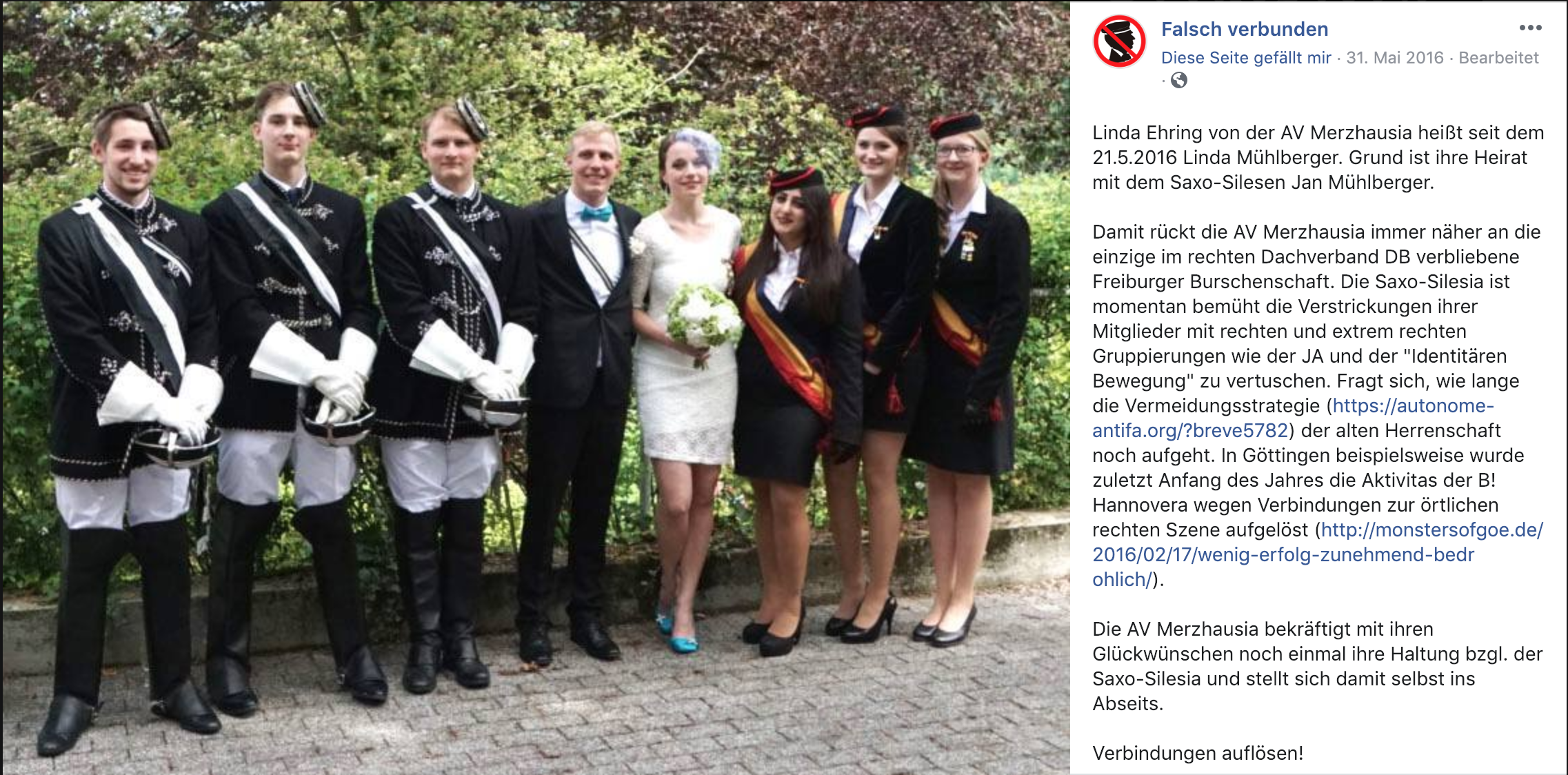 Mühlberger ließ unerwähnt, dass alle „Alten Herren“ der „Saxo-Silesia“ im Vorfeld eine Postkarte von der Antifa erhielten, was zu einer wesentlich geringeren Beteiligung „Alter Herren“ samt Begleitung am Stiftungsfest auf dem Schlossberg als erhofft führte und damit zu einer deutlichen Unterschreitung des mit dem Burschenlokal Dattler vereinbarten Mindestverzehrs und somit zu einem finanziellen Verlust der „Saxo-Silesia“. Auf der Vorderseite der Postkarten war ein Aufkleber mit einem Foto der beiden einzigen damals aktiven „Saxo-Silesen“. Zu sehen ist darauf Martin Hirth nach seiner Mensur mit blutüberströmtem und zersäbeltem Gesicht samt eines „aus Spaß“ in die Mensurwunde eingenähten Knopfes. Im Hintergrund steht Jan Mühlberger, feist grinsend, der im Mai 2016 Linda Ehring von der „Merzhausia“ geheiratet hat. Oben ist in roten Lettern zu lesen: „Burschen vorknöpfen!“ Auf der Rückseite der Postkarte stand: „Alter Herr! Wir freuen uns, dich und deine Begleitung Pfingsten in Freiburg begrüßen zu dürfen. Deine Antifa“