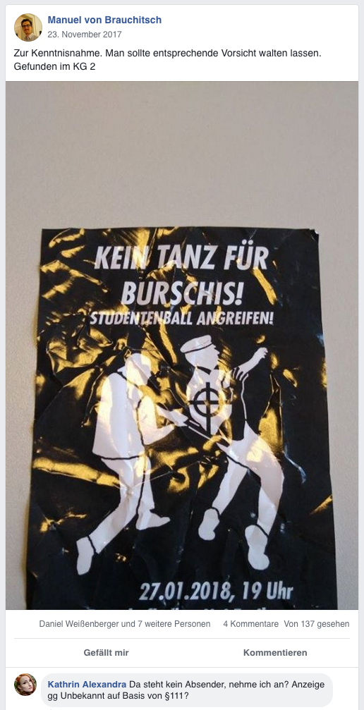 Auch die „Junge Freiburg“-Vorsitzende Kathrin Vogel beteiligte sich an der Facebook-Gruppe „Freiburger Korporierte“ und machte aktiv antilinke Politik. Als Manuel von Brauchitsch von einem linken Aufkleber gegen den jährlichen „Studentenball“ am 27. Januar 2018 berichtete, empfahl Vogel eine Anzeige wegen öffentlicher Aufforderung zu Straftaten: „Da steht kein Absender, nehme ich an? Anzeige gg Unbekannt auf Basis von §111?“