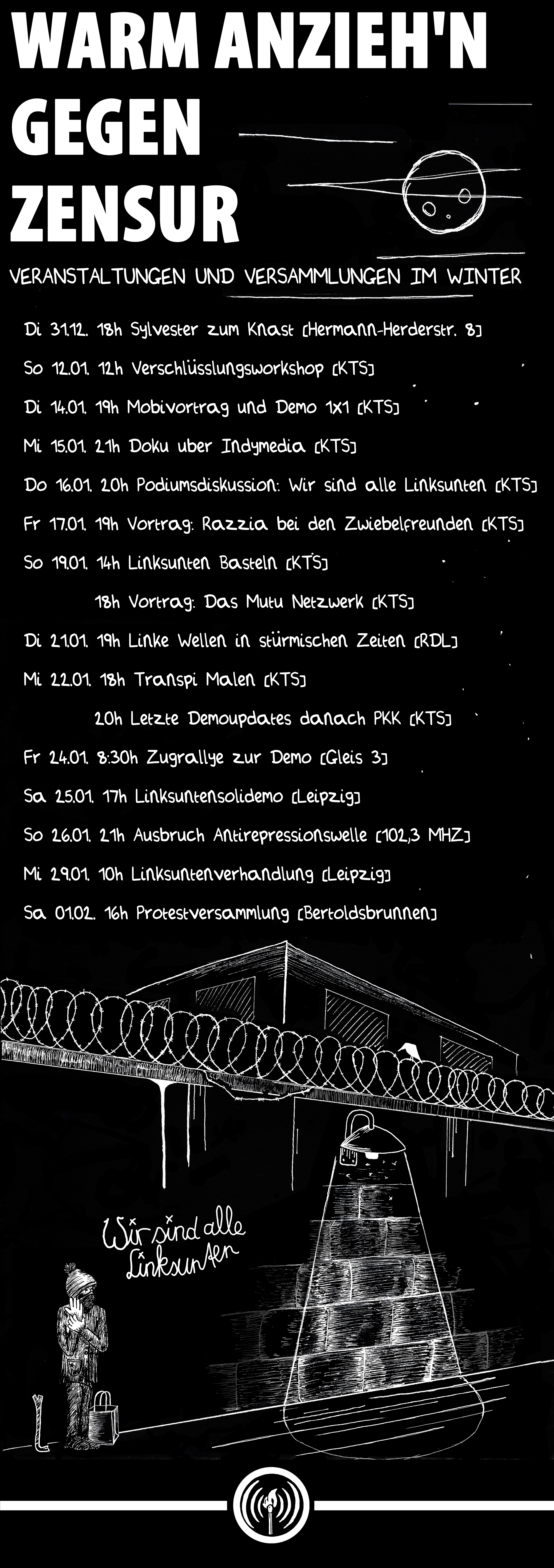 Vor zwei Jahre hat das Innenministerium linksunten verboten. Seit zwei Jahren vermissen wir die OpenPosting-Plattform schmerzhaft. Am 29. Januar 2020 entscheidet das Bundesverwaltungsgericht in Leipzig über die Zensur des linken Medienportals linksunten.indymedia.org. Das Verbot von linksunten.indymedia.org und der Angriff auf linke Strukturen führten im Sommer 2017 zu Razzien in Freiburg und setzten Teile der linksradikalen Szene massiver Kriminalisierung aus. Aus diesem düsteren Anlass haben unterschiedliche Zusammenschlüsse zu bundesweiten Aktionen aufgerufen. In Leipzig findet am 25. Januar eine bundesweite Demonstration statt und nach dem Prozesstag wird es am 1. Februar eine Protest-Versammlung in Freiburg geben. Um für die unterschiedlichen Protestaktionen zu mobilisieren, organisieren wir in Freiburg eine Veranstaltungsreihe im Januar.