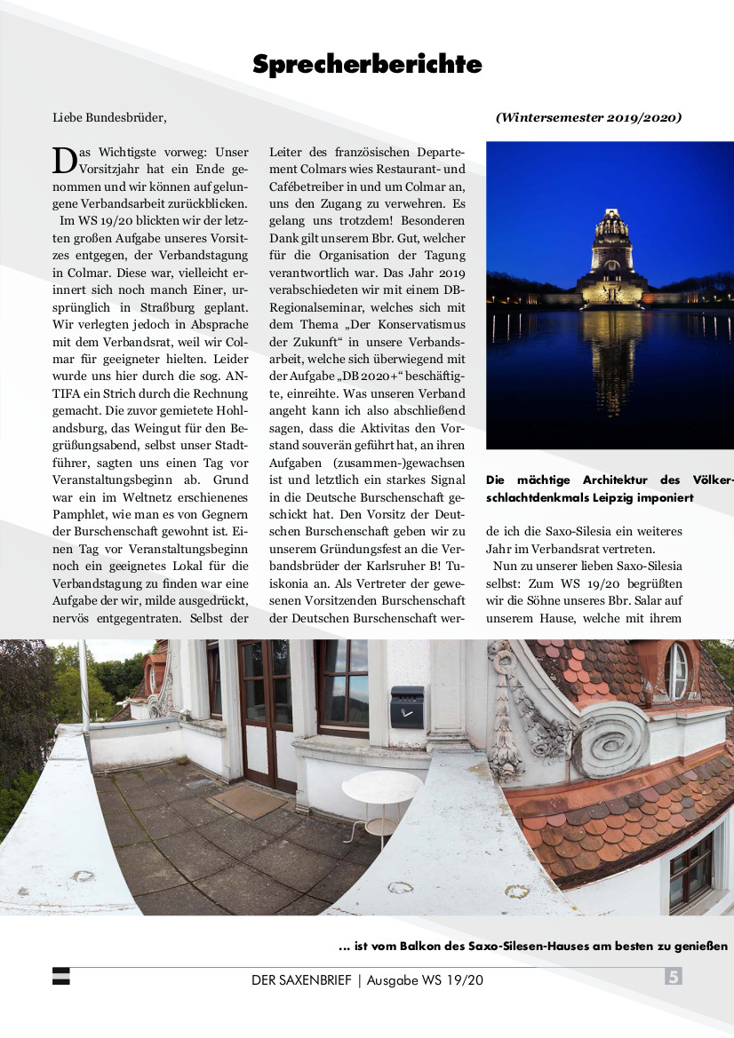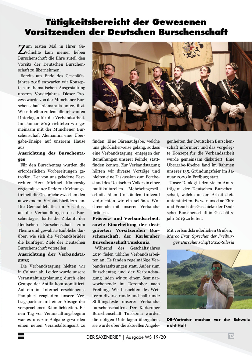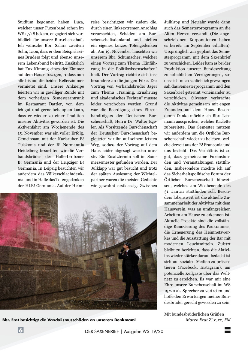 Marco Erat veröffentlichte im „Saxenbrief“, dem internen Mitteilungsblatt der Saxo-Silesia, in der Ausgabe des Wintersemesters 2019/2020 einen „Tätigkeitsbereicht der Gewesenen Vorsitzenden der Deutschen Burschenschaft“. Darin beklagte er sich über die von uns sabotierte Verbandstagung im Elsass: