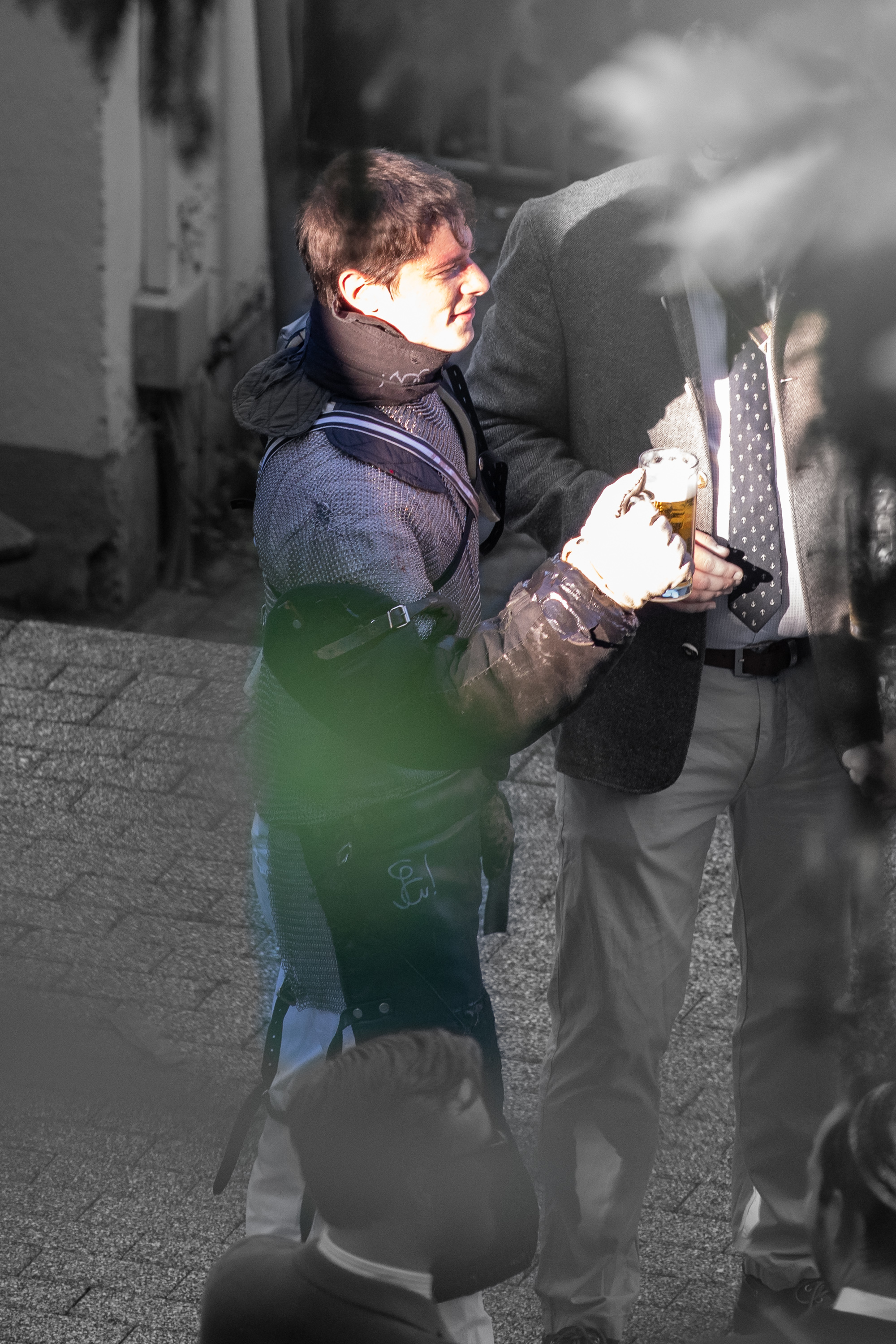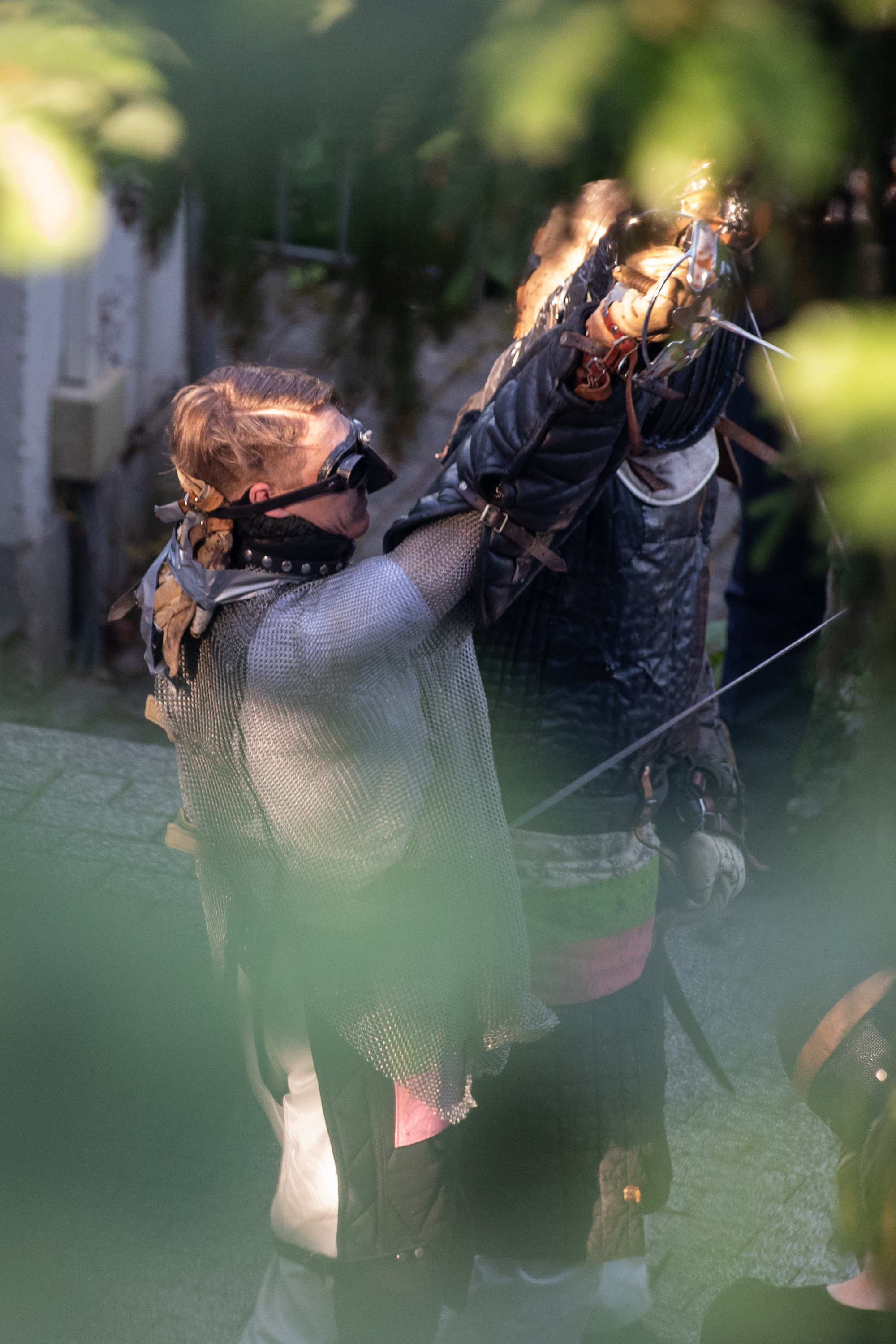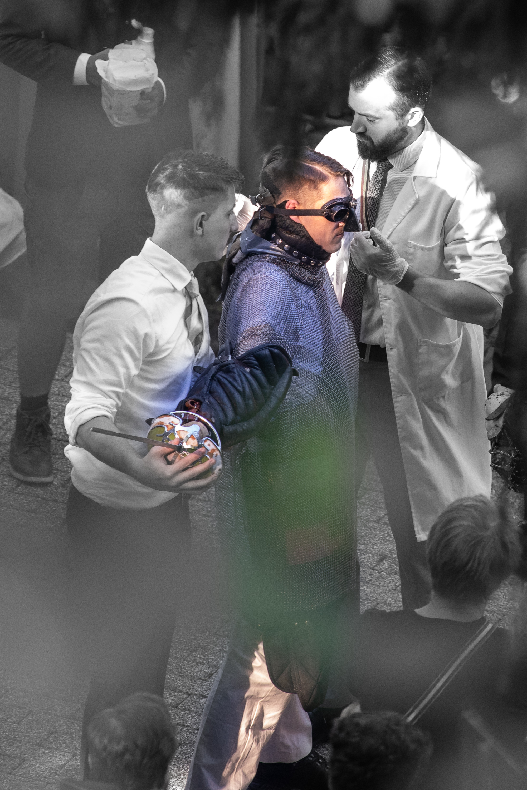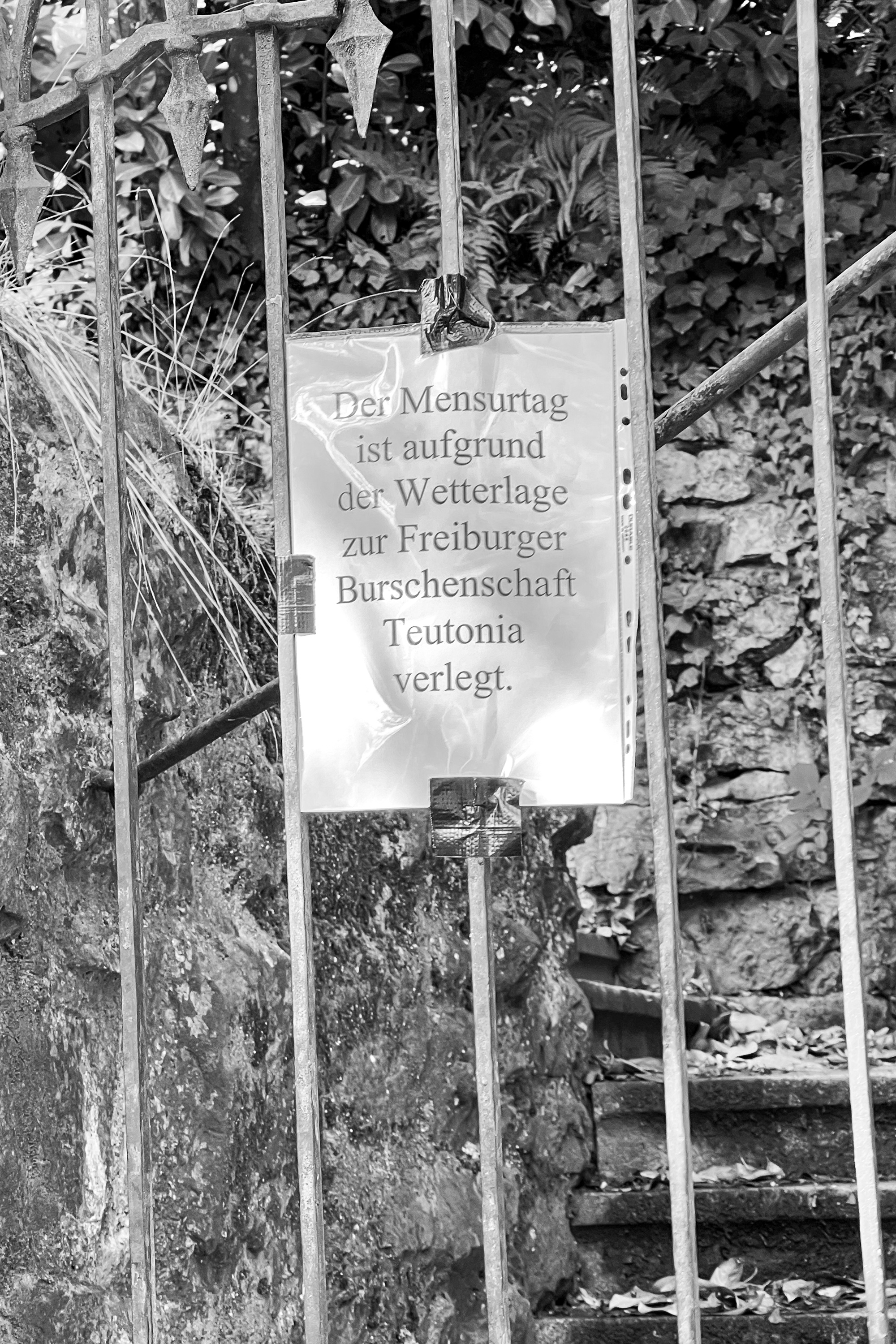 In dem „Münchener Schlägerpaukcomment“ werden die Beteiligten an der Mensur – selbstverständlich nur Männer – festgelegt: „Zur Mensur gehören zwei Paukanten, zwei Sekundanten, zwei Schleppfüxe, ein Unparteiischer, zwei Schriftführer, mindestens ein approbierter Arzt und je drei Burschen jeder beteiligten Verbindung.“ Darüber hinaus gilt eine „Mensur“ im Verbindungsmilieu als soziales Event, zu dem andere Korporierte eingeladen werden. Uns stellte der „Schlägerpaukcomment“ vor ungeahnte Schwierigkeiten, denn „Partien dürfen nur mit Einverständnis beider Paukanten und dann nur ohne Blitzlicht fotographiert werden“ und „nicht farbentragende Gäste dürfen auf Mensurtagen nicht fotographieren“.