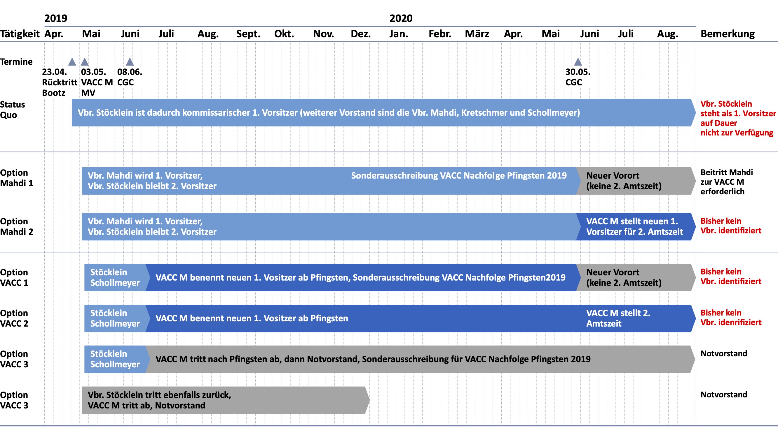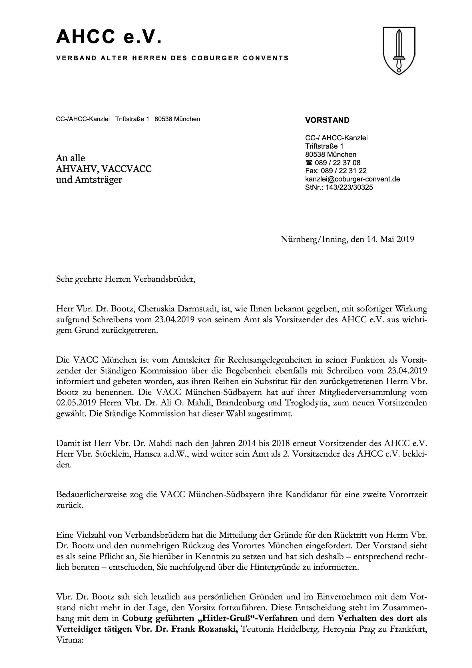 Gegenüber der Neuen Presse Coburg vom 21. Mai 2018 sparten der alte CC-Vorsitzende und HNO-Arzt Ali Ottmar Mahdi, Landsmannschaft Brandenburg Berlin und Landsmannschaft Troglodytia Kiel, VACC Nürnberg und VACC München-Südbayern, und der damals neue CC-Vorsitzende und BMW-Manager Andreas Bootz, Cheruskia Darmstadt, VACC München-Südbayern, nicht mit markigen, wenn auch hohlen Worten:
