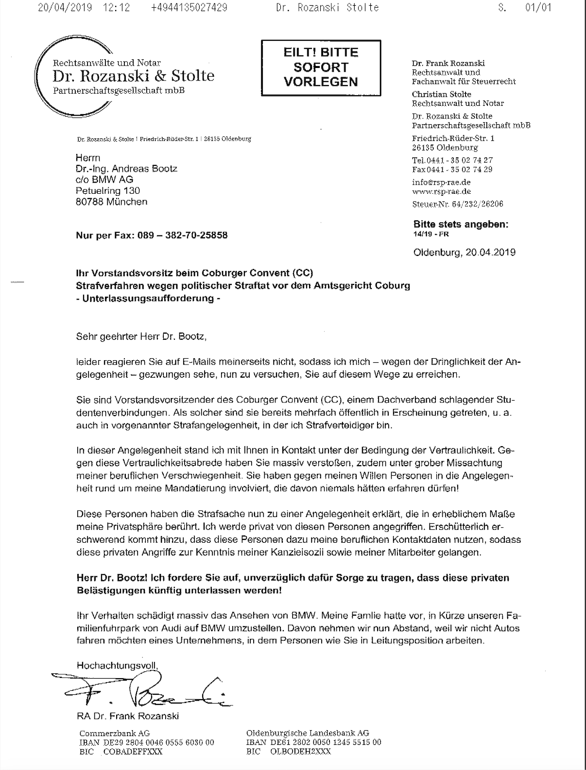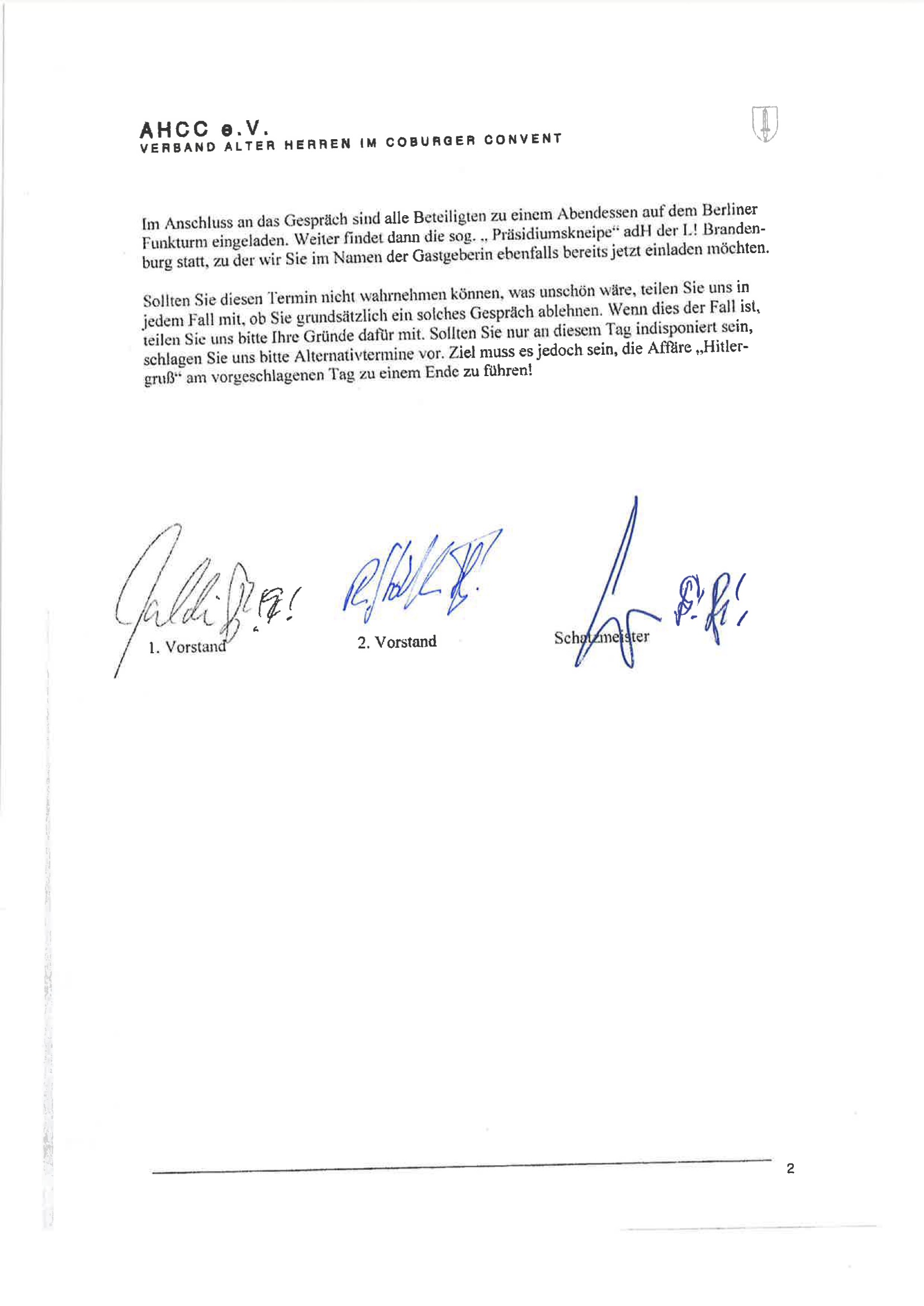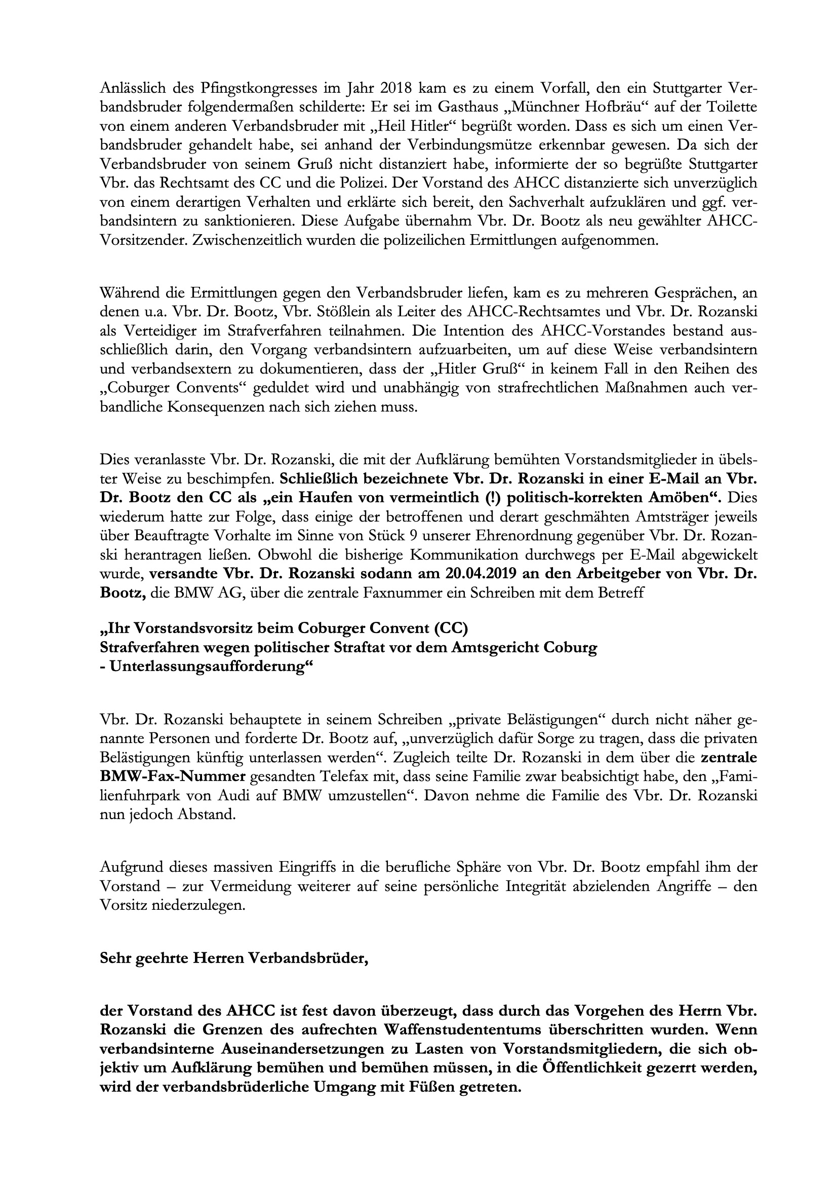 Interessant ist die Ankündigung des damaligen CC-Pressesprechers Frank Klauss aus Potsdam, der für die BILD-Zeitung arbeitet und Mitglied der Turnerschaft Munichia Bayreuth und der Landsmannschaft Gottinga Göttingen ist. Er behauptete, den Täter bei der Polizei anzuzeigen, sobald der Verband Alter Herren des Coburger Convents (AHCC) Kenntnis von der Identität des Täters und seines Bundes erlangen sollte: