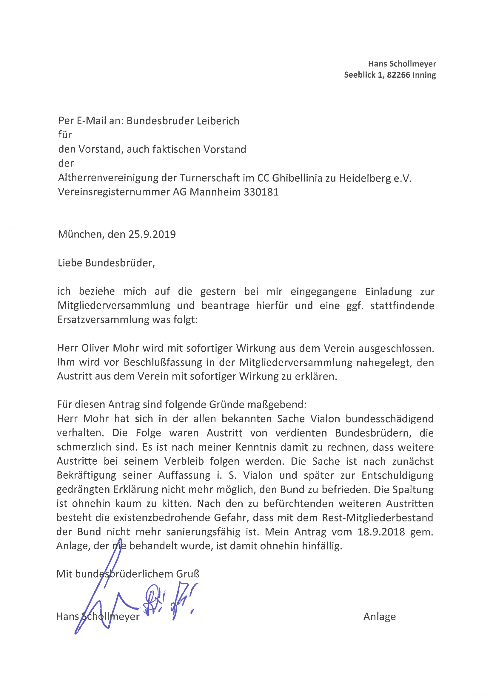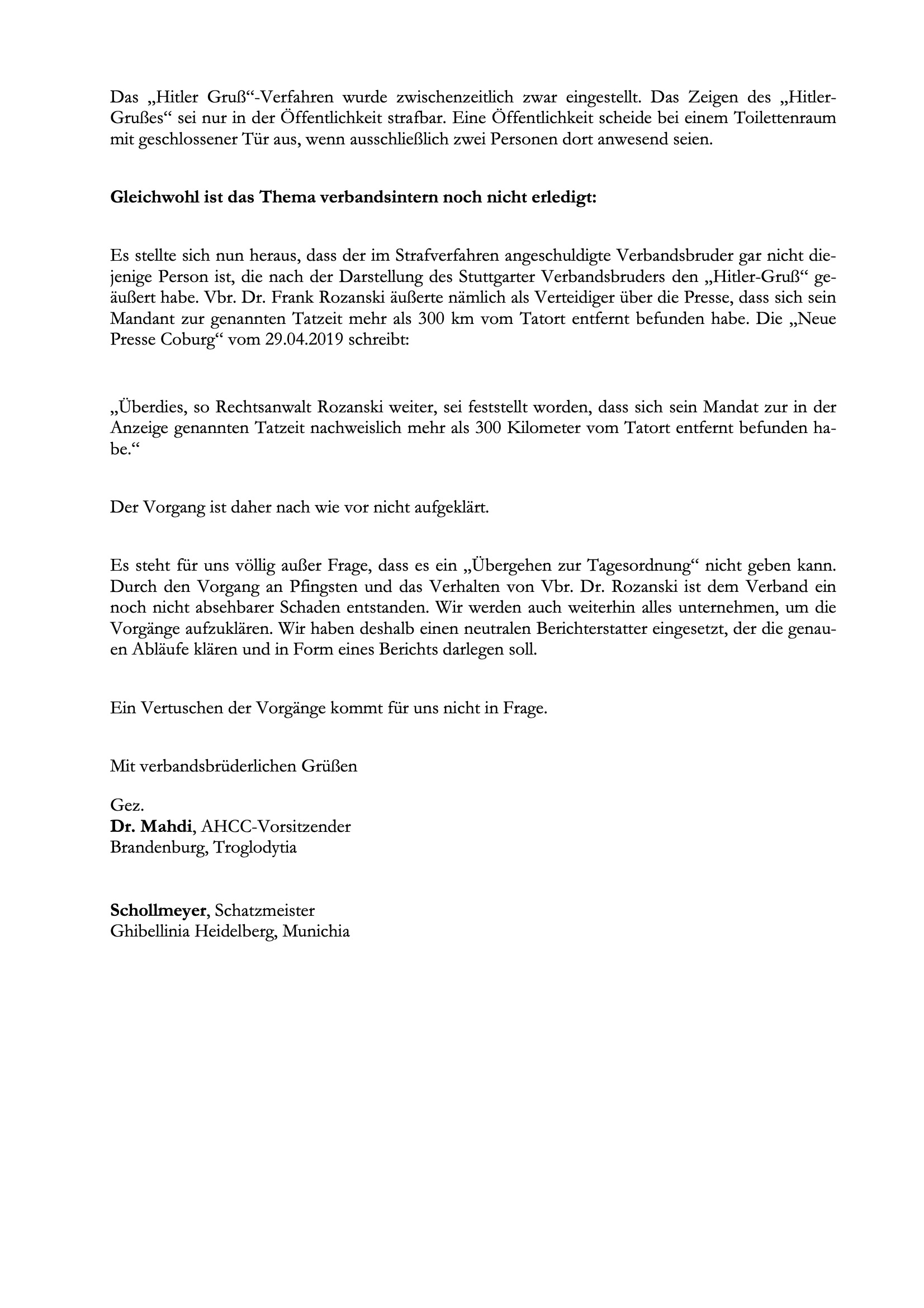 Ich erlaube mir im Hinblick auf die Besetzung des Ehrengerichts darauf hinzuweisen, dass mein Bundesbruder Werner Albrecht mit Roz befreundet ist (siehe facebook) und über seinen Sohn Florian Albrecht mittelbar mit Roz verbunden ist. Florian Albrecht ist Hercyne und Virune, wie Roz.