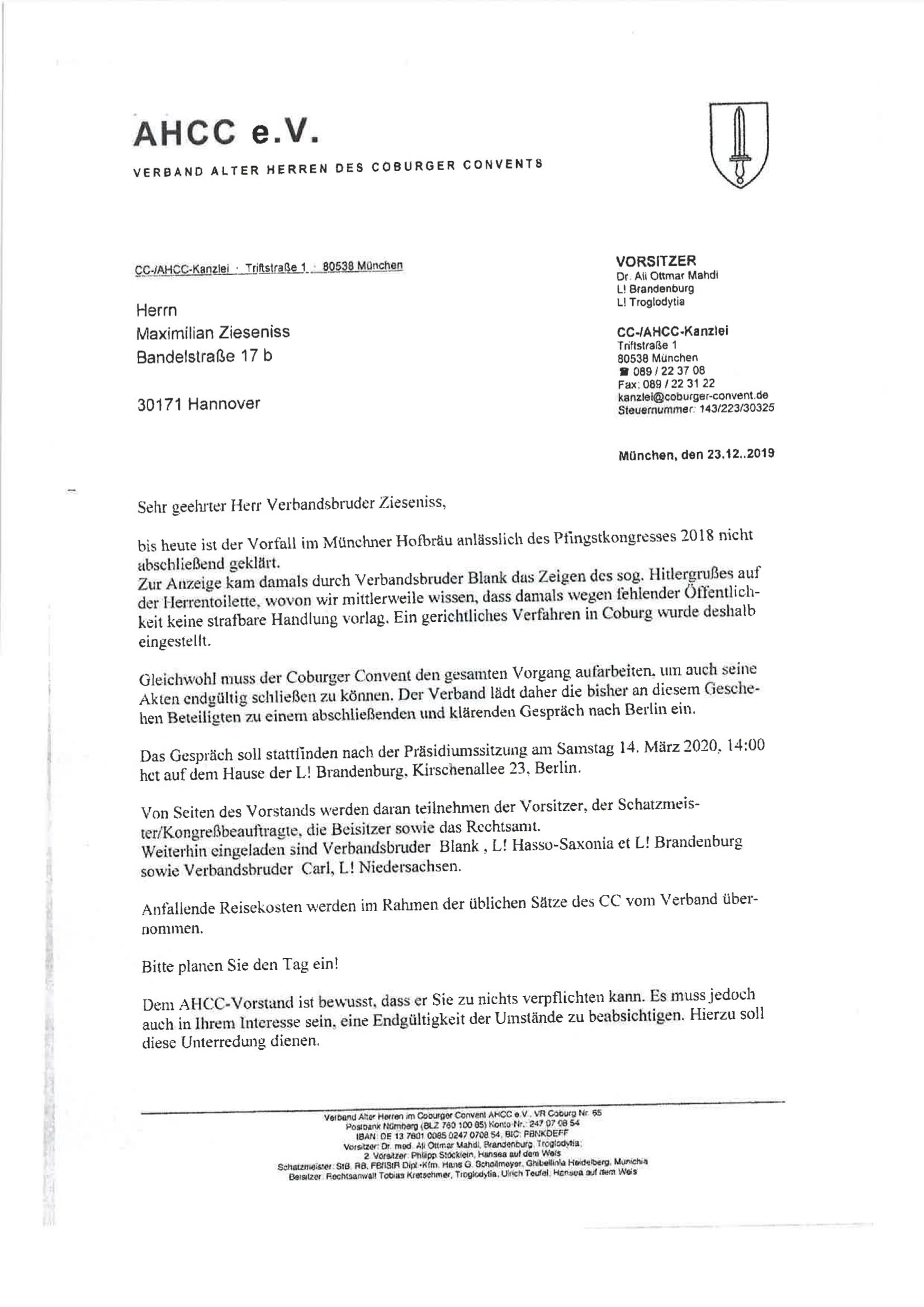 Auf dem „Pfingstkongress“ des Coburger Convents im Mai 2018 grüßte ein „Landsmannschafter“ einen anderen mit „Heil Hitler!“ auf dem Männerklo. Der so Gegrüßte stellte Strafantrag, die Polizei verdächtigte den Falschen, das Gerichtsverfahren wurde eingestellt. Dieses Communiqué rekonstruiert die Geschichte einer Verschwörung von Waffenstudenten, die um den „guten Ruf“ ihrer Organisation besorgt waren, sollte die Identität des Hitlergrüßers bekannt werden. Zu Recht: Maximilian Zieseniß ist „Alter Herr“ der Landsmannschaft Niedersachsen im CC zu Hannover und Richter am Amtsgericht Gifhorn.