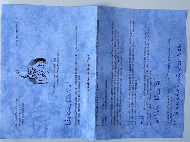 Im März 2020 werde ich meinen 75. Geburtstag begehen. Dieses Ereignis möchte ich mit der Famile und meinen Freunden im Rahmen eines