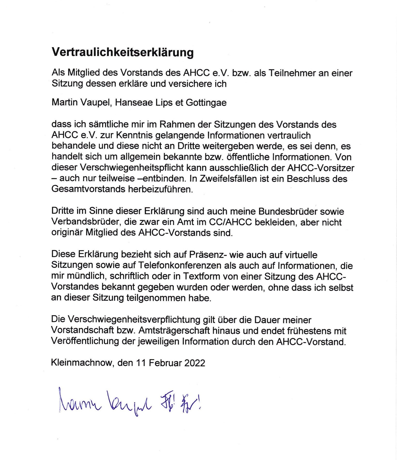 Gerne teile ich Dir in Deiner Eigenschaft als AHCC-Vorsitzender den aktuellen Stand wie folgt mit: Austrittsgesuche sind bei meiner lb. Viruna immer auf dem zuständigen Convent, in diesem Fall dem AHC, zu verhandeln. Pandemiebedingt ist der erstmögliche AHC-Termin der 17.06.22.