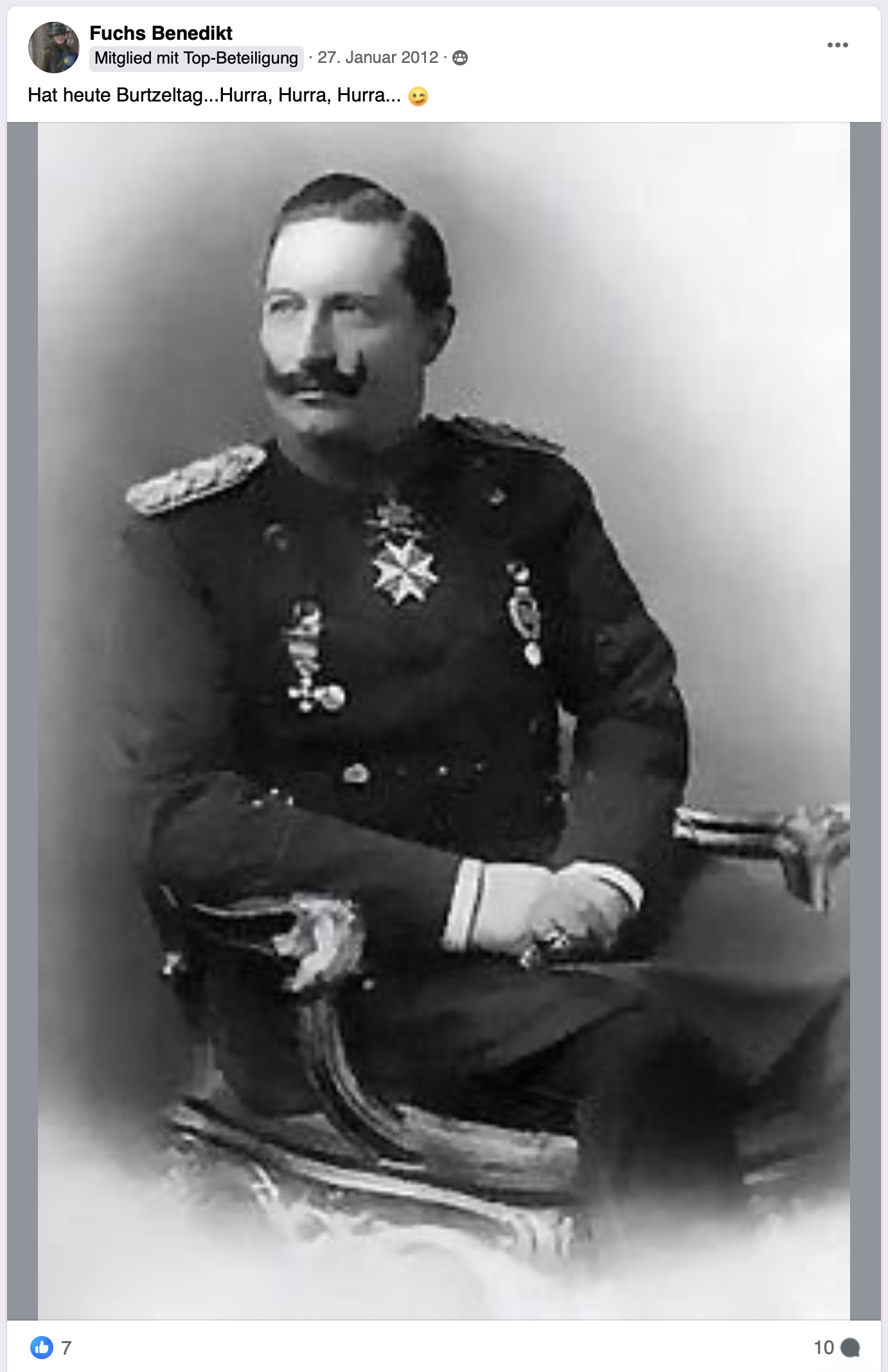 Immerhin gratulierte Bengt Fuchs nur Kaiser Wilhelm II. zum Geburtstag. Allerdings am 27. Januar, dem Tag des Gedenkens an die Opfer des Nationalsozialismus. Fuchs postete ein antikes Foto des letzten deutschen Kaisers mit dem Kommentar: