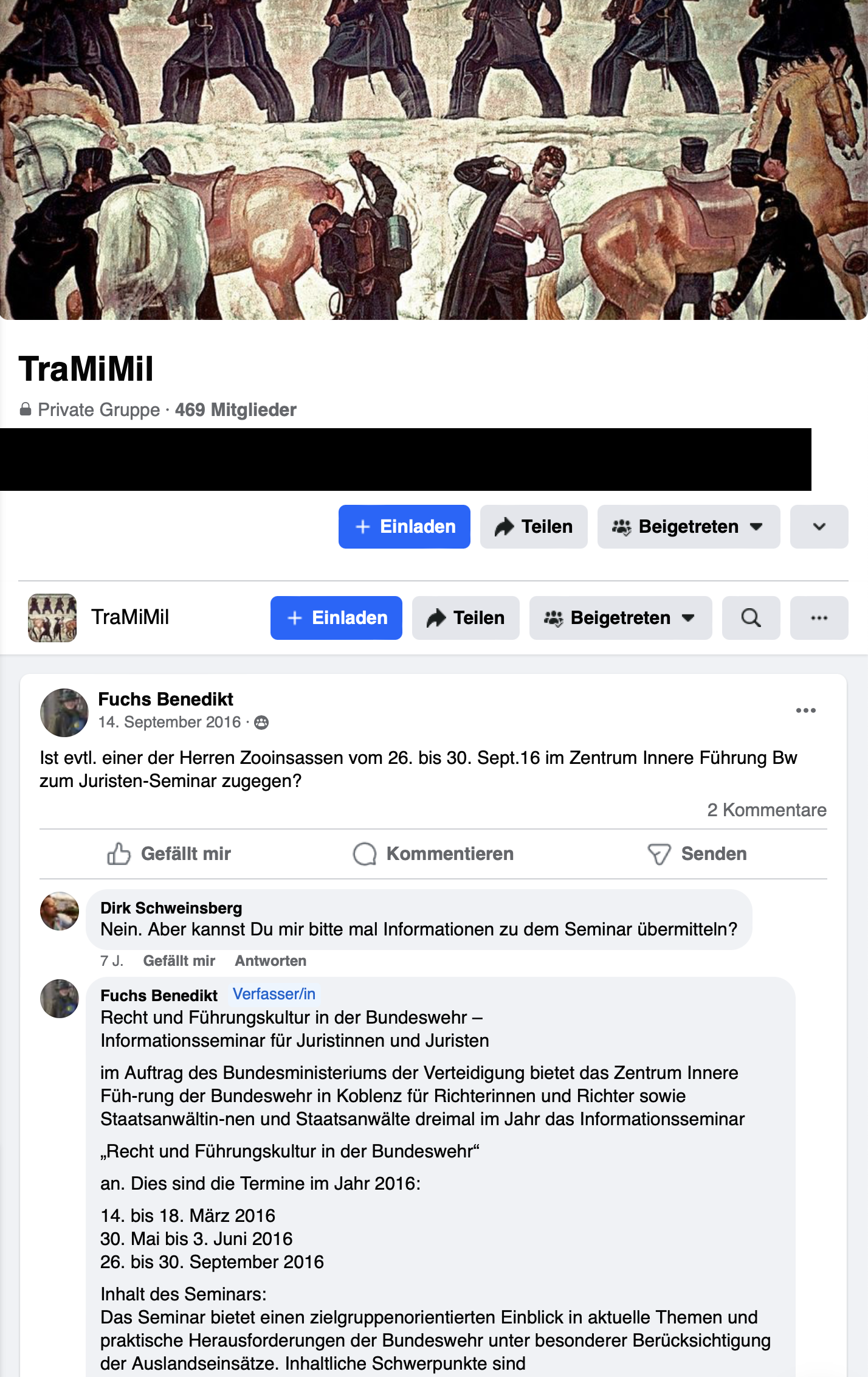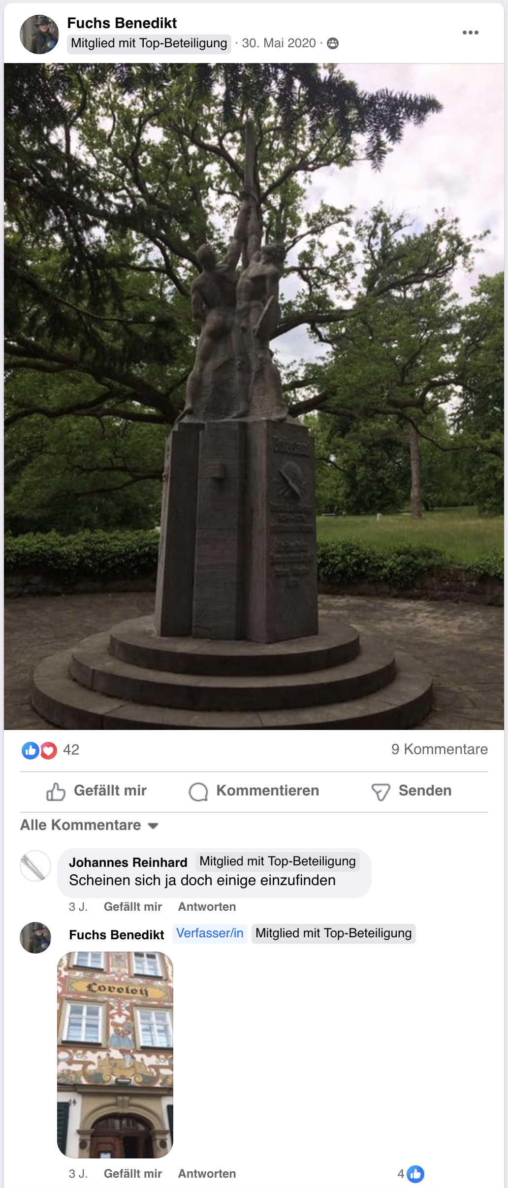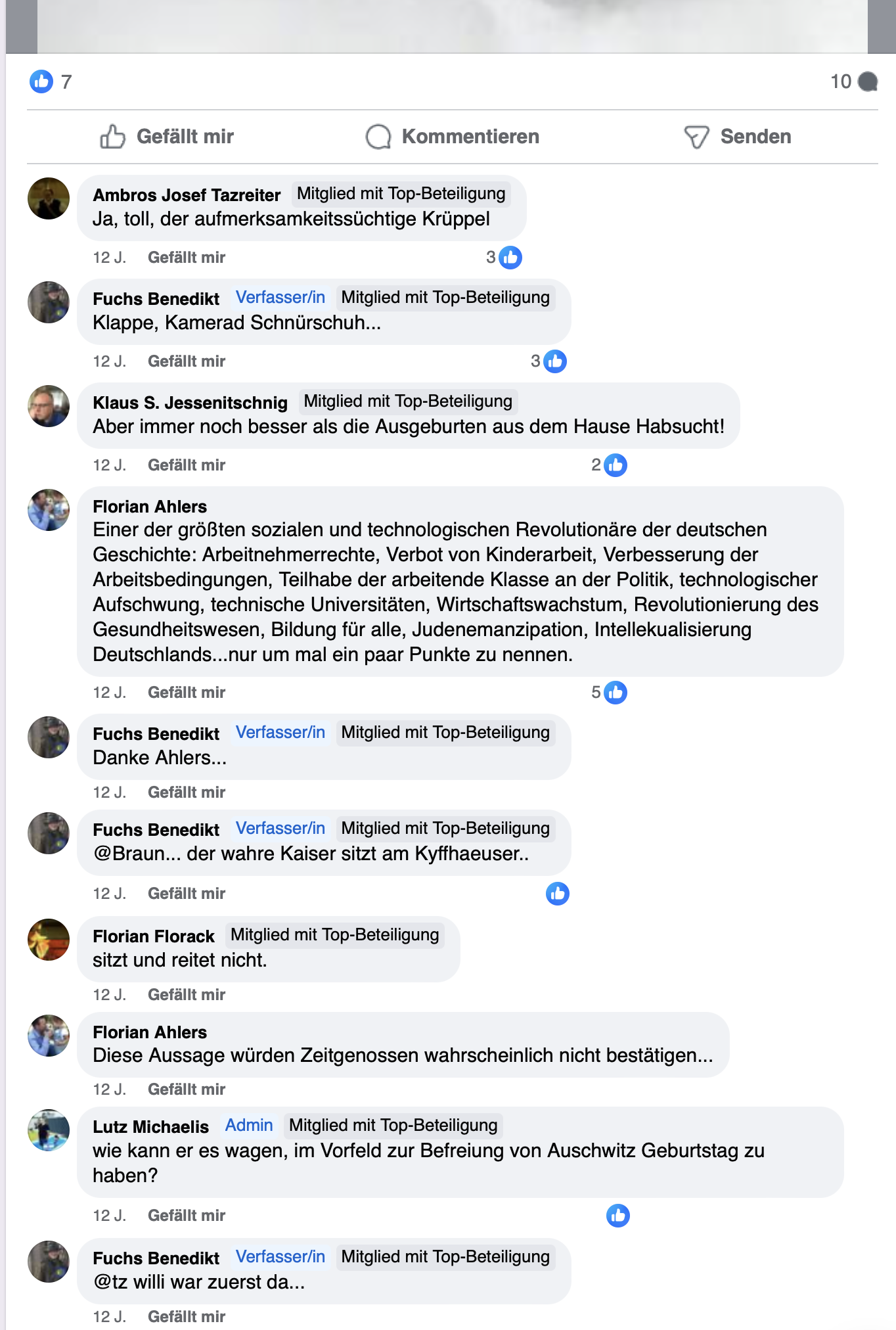 In „Privaten Gruppen“ auf Facebook hingegen lässt Bengt Fuchs regelmäßig jegliche Mäßigung vermissen. Nur dürfte eine „Private Gruppe“ wie „Tradition mit Zukunft“ mit über 15.000 korporierten Mitgliedern juristisch gesehen als Öffentlichkeit gelten.