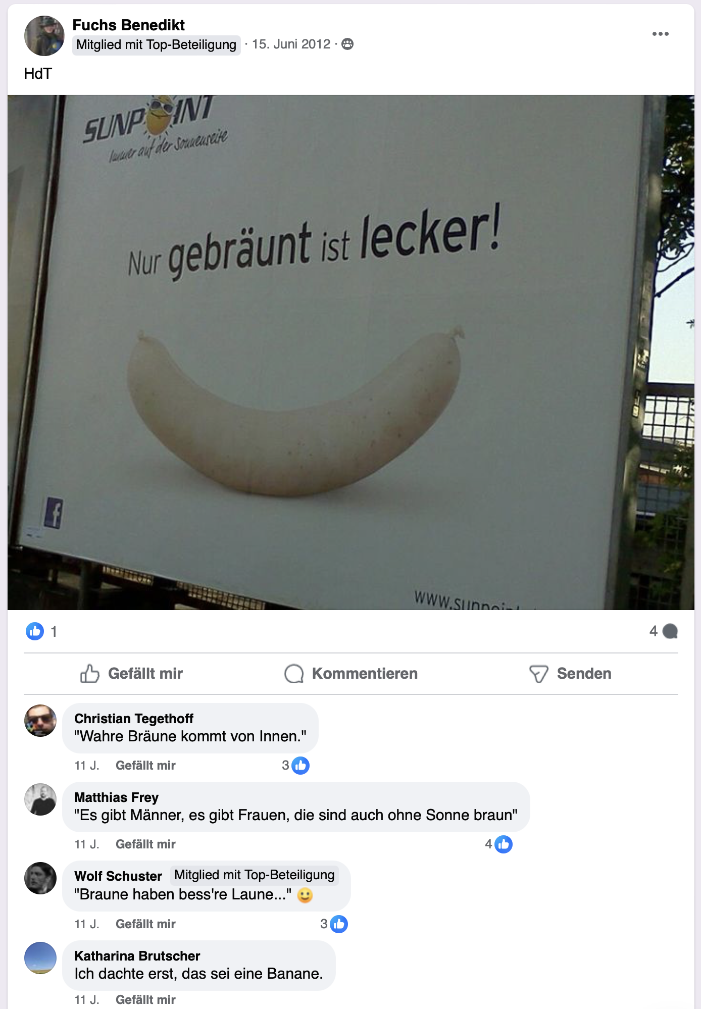 In der Gruppe postete Bengt Fuchs am 15. Juni 2012 das Foto einer Werbung der „Sunpoint“ Sonnenstudiokette. Darauf zu sehen ist eine ungegrillte Thüringer Bratwurst mit dem Slogan: