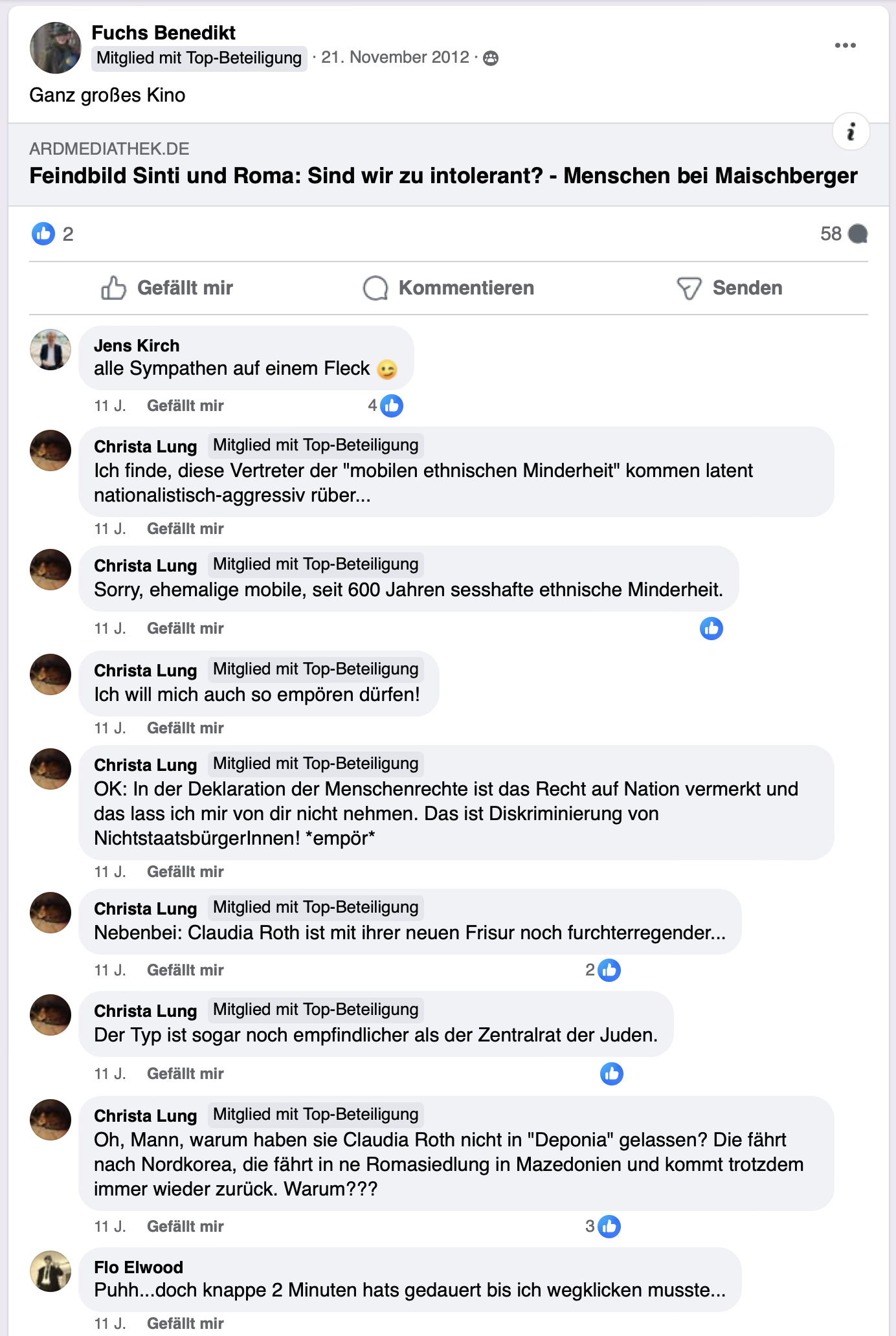 Auffällig ist, dass Bengt Fuchs über die Jahre immer wieder gegen Sinti und Roma hetzt. Am 21. November 2012 postete er ebenfalls in der Facebook-Gruppe „Tradition mit Zukunft“ einen Link zu einer ARD-Dokumentation „Feindbild Sinti und Roma: Sind wir zu intolerant? - Menschen bei Maischberger“. Erwartbar reagierten die Korporierten mit Antiziganismus („Ich finde, diese Vertreter der ,mobilen ethnischen Minderheit‘ kommen latent nationalistisch-aggressiv rüber...“) und einer Prise Antisemitismus („Der Typ ist sogar noch empfindlicher als der Zentralrat der Juden“). Nachdem die passende Stimmung evoziert war, machte Bengt Fuchs einen rassistischen Spruch: