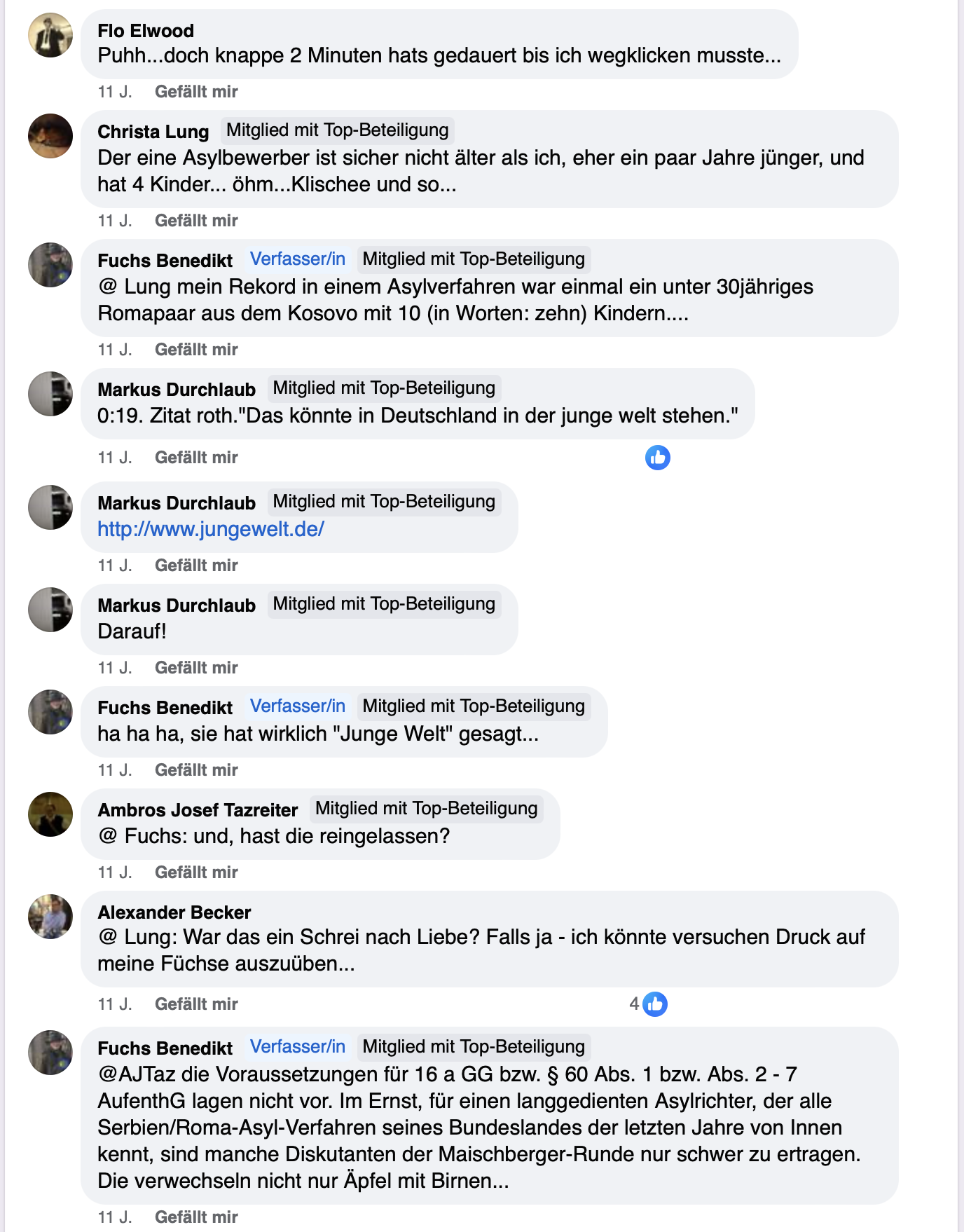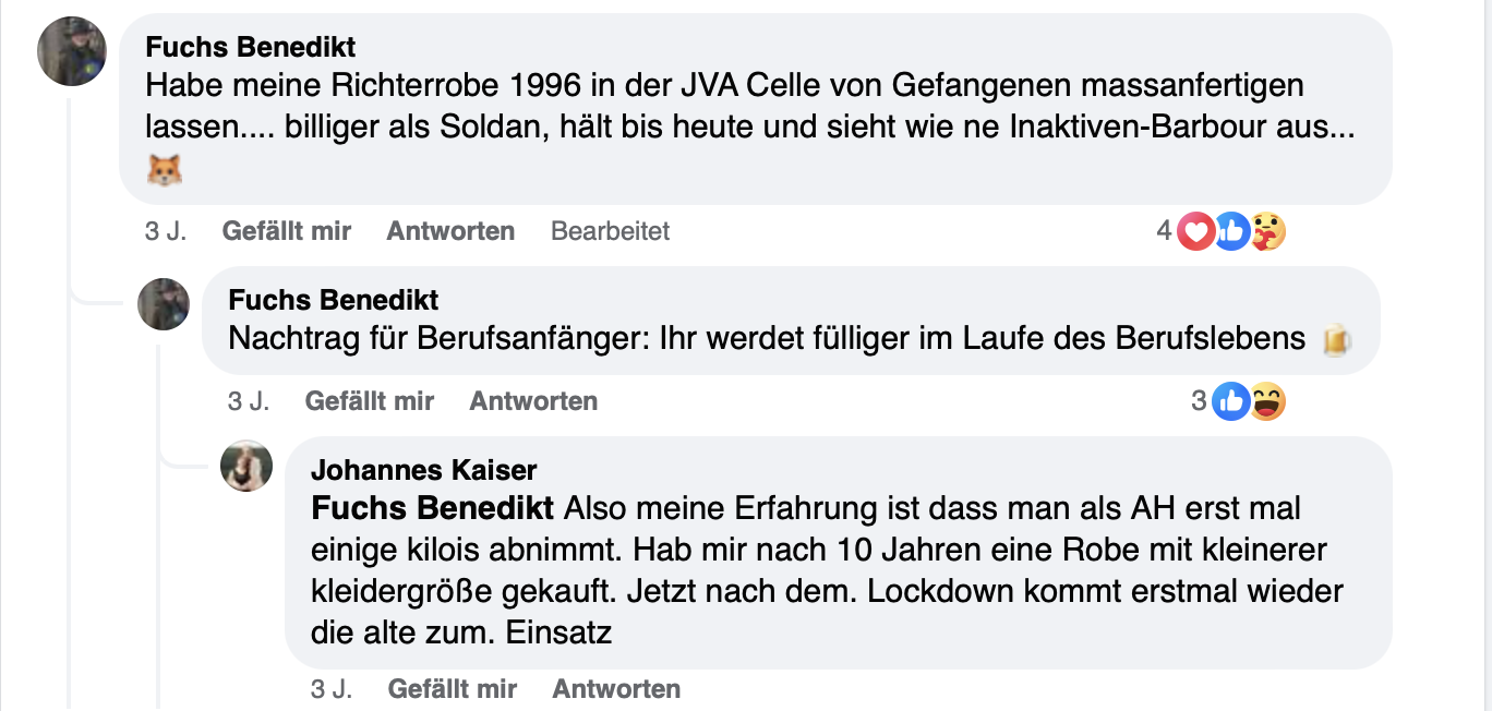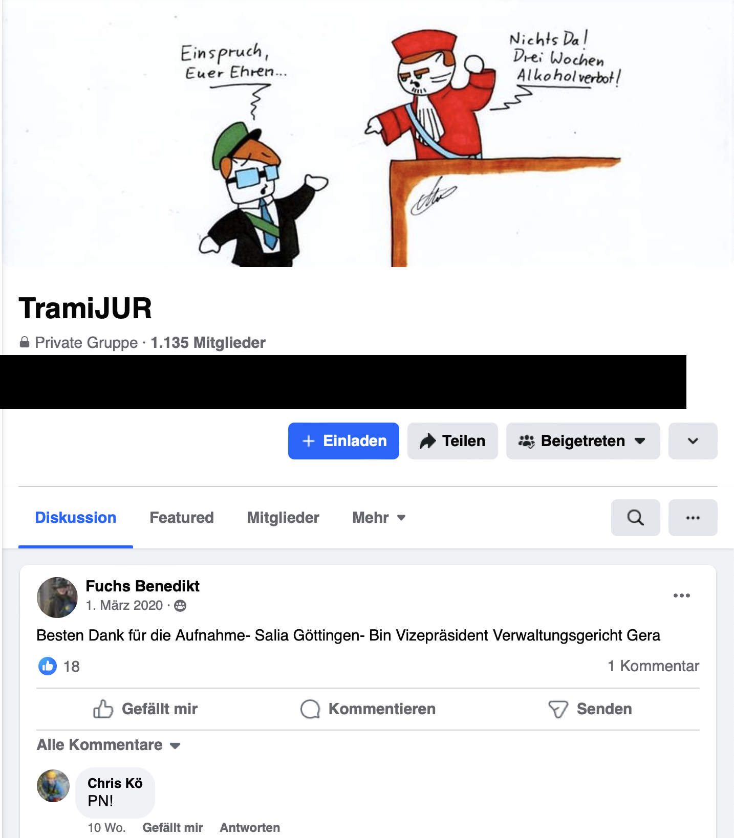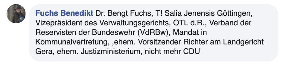 Doch die Thematisierung des korporierten Hintergrunds ist notwendig, um die Person des Richters zu verstehen. Fuchs war Fördermitglied auf tradition-mit-zukunft.de und später ein „Mitglied mit Top-Beteiligung“ in der deutschsprachigen „korporierten Öffentlichkeit“ auf Facebook. Hier wähnt er sich sicher. Unter seinesgleichen. Hier lässt er offen den rechten Hardliner raushängen und hier pflegt er die stillen Seilschaften. Im Stil geschliffen, im Ton verachtend, hetzt Bengt Fuchs gegen ganze Bevölkerungsgruppen. Vor über 15.000 Korporierten. Vor seinesgleichen.