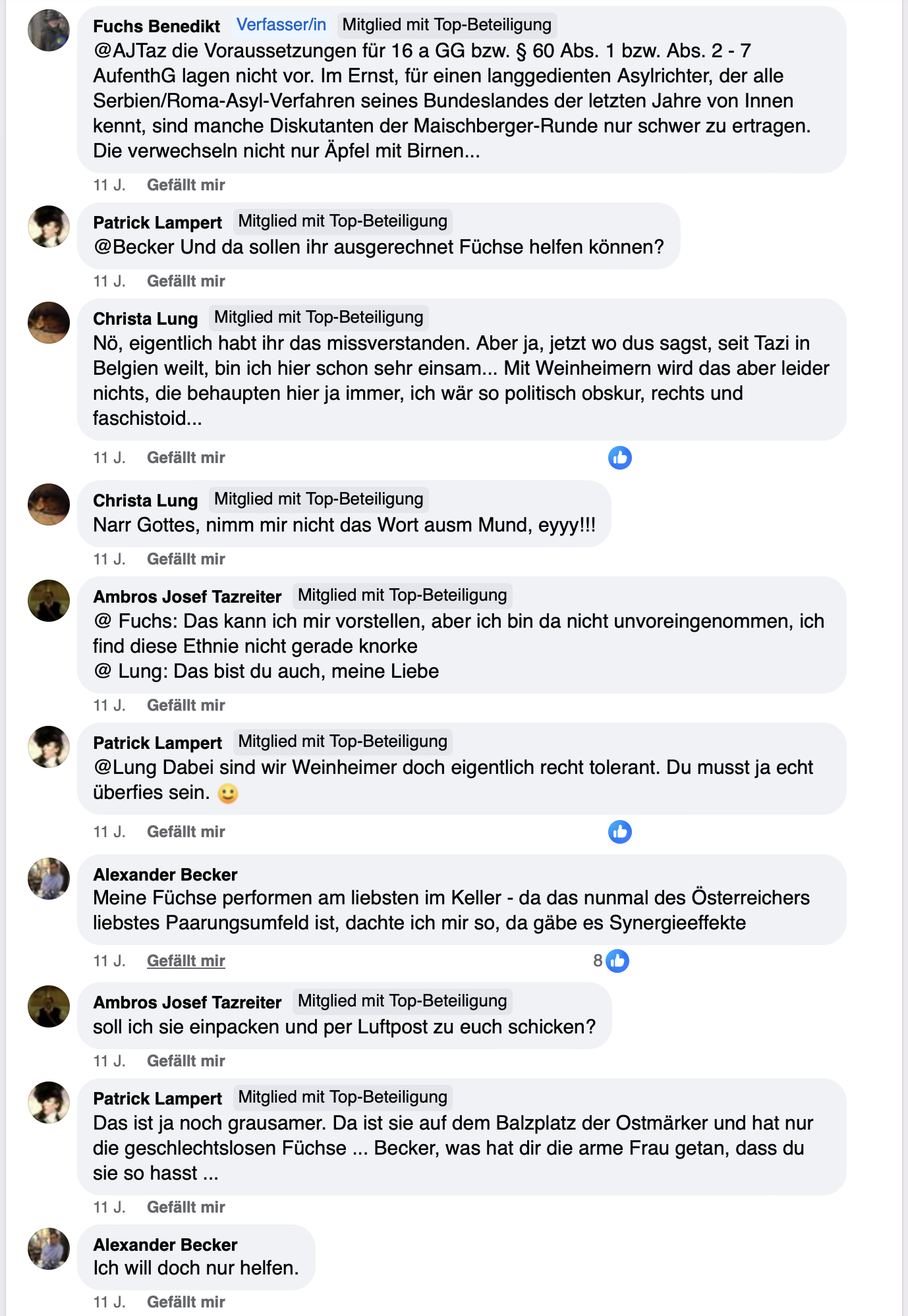 Die Korporierten überboten sich daraufhin in rassistischem Zynismus („Fahrendes Volk oder Katzenfresser wären doch auch noch politisch korrekte Optionen“) und plumpem Antiziganismus („Wanderndes Diebesvolk dessen Namen nicht genannt werden darf“). Auch Bengt Fuchs leistete seinen Beitrag, für den er mit neun Grinsesmileys den Wettbewerb gewann: