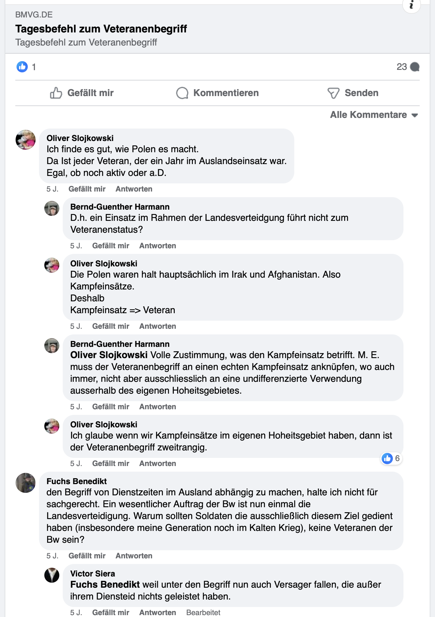 den Begriff von Dienstzeiten im Ausland abhängig zu machen, halte ich nicht für sachgerecht. Ein wesentlicher Auftrag der Bw ist nun einmal die Landesverteidigung. Warum sollten Soldaten die ausschließlich diesem Ziel gedient haben (insbesondere meine Generation noch im Kalten Krieg), keine Veteranen der Bw sein?
