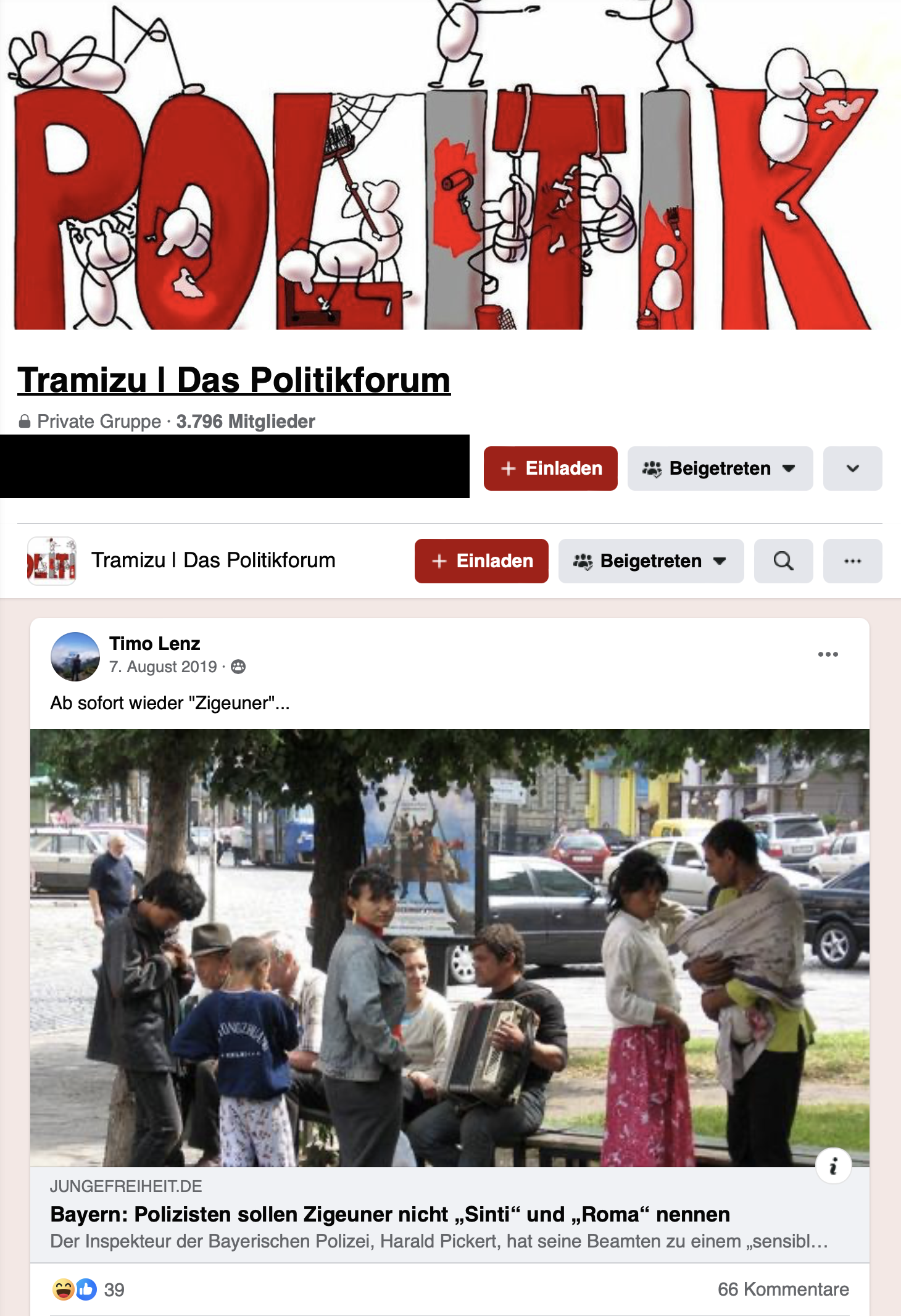 Am 7. August 2019 postete Timo Lenz, „Alter Herr“ der Landsmannschaft Preußen Berlin im Coburger Convent und Berliner AfD-Politiker in „Tramizu | Das Politikforum“ einen Link zu einem Artikel in der Nazizeitung Junge Freiheit mit dem Titel „Bayern: Polizisten sollen Zigeuner nicht ,Sinti‘ und ,Roma‘ nennen“ und dem Kommentar: