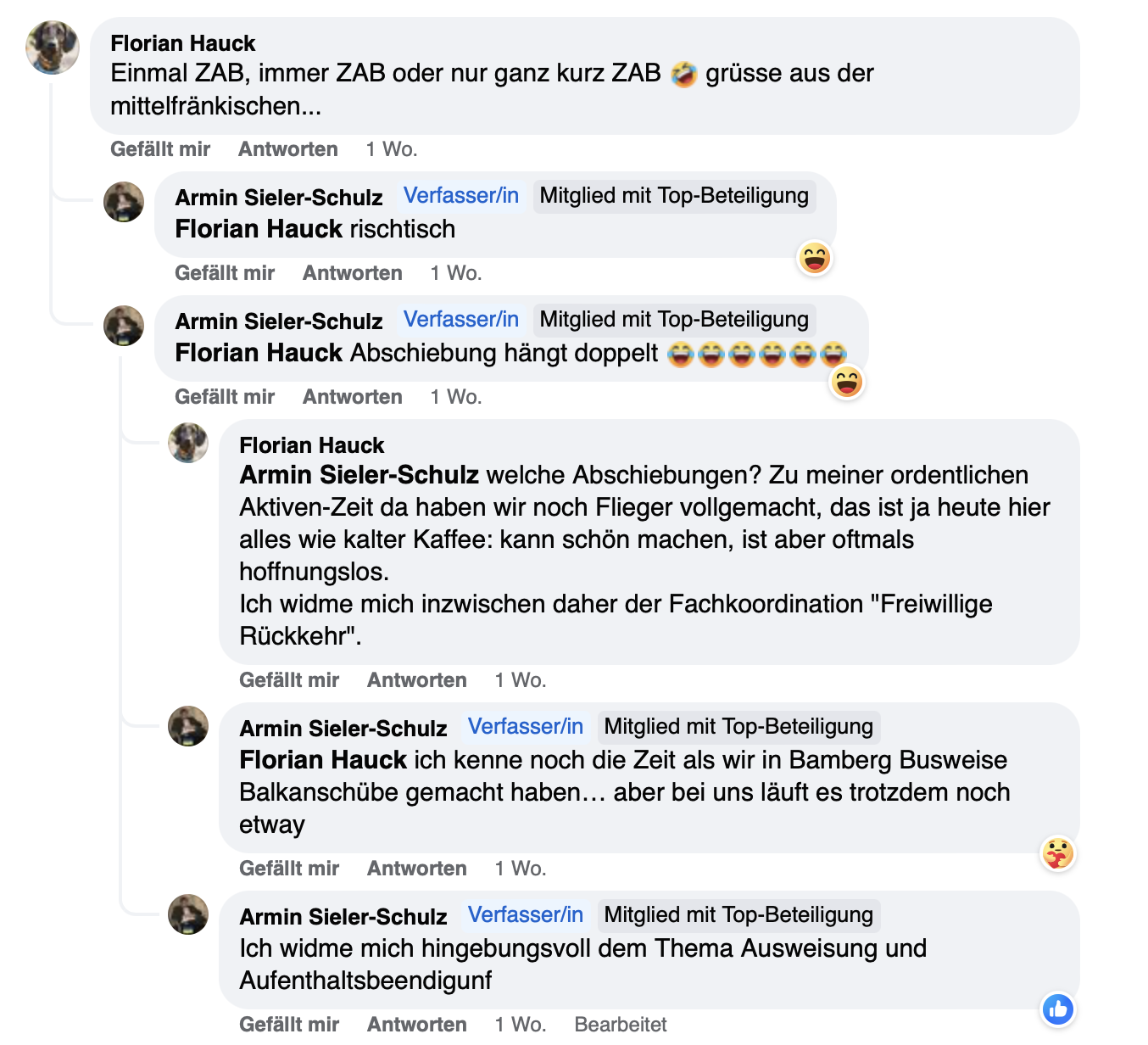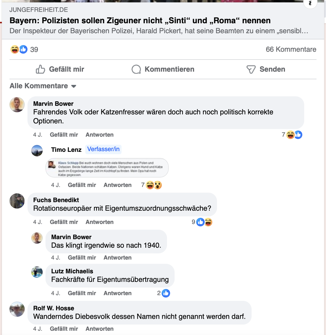 Bengt Fuchs bekam auf seinen antiziganistischen Kommentar zwei Antworten. Eine affirmative: „Fachkräfte für Eigentumsübertragung“. Und eine unerwartete: „Das klingt irgendwie so nach 1940“.
