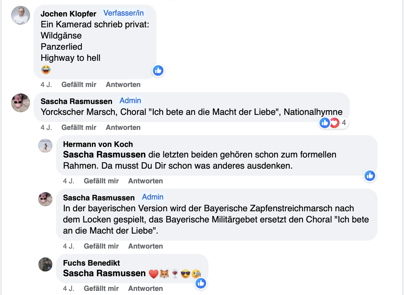 Und wem flogen 2020 Bengts Fuchs’ Herz- und Fuchsemoticons in dem lustigen „Annahme: Ihr erhaltet den Großen Zapfenstreich. Welche drei Lieder wählt ihr?“-Thread zu? Natürlich Sascha Rasmussen von der Turnerschaft Berlin im Coburger Convent für seine patriotische Liedauswahl: