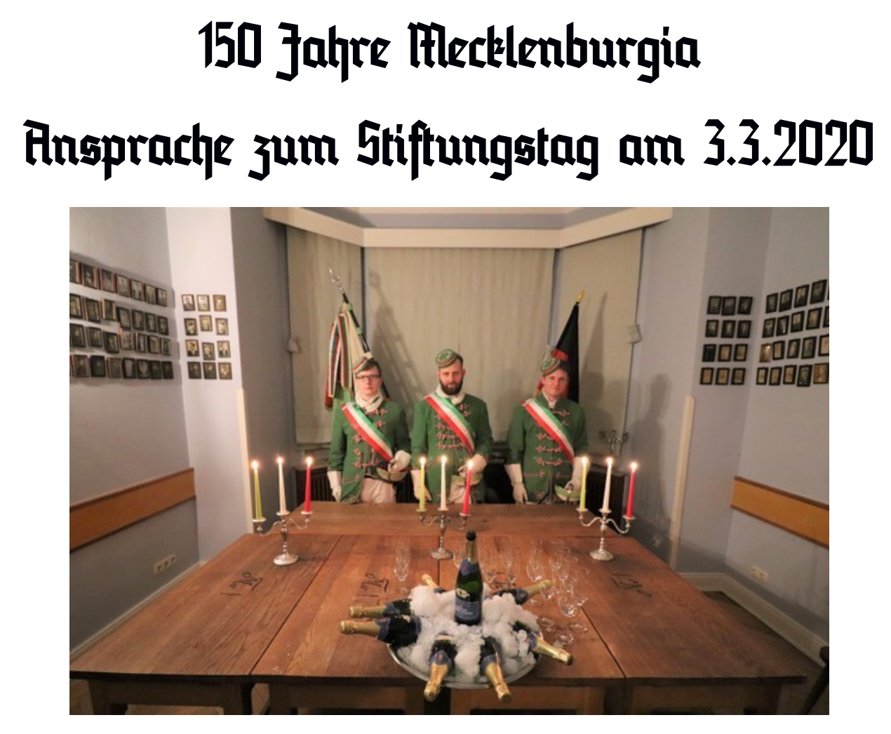 Im ersten Kapitel Zur Geschichte der Mecklenburgia werfen wir ein Schlaglicht auf drei Epochen der Mecklenburgia Hamburg: Die Gründung als „Mecklenburgische Kneipgesellschaft“ in Leipzig bis zur Aufnahme in die Deutsche Landsmannschaft, die Zeit als „Kameradschaft“ im Nationalsozialistischen Deutschen Studentenbund und die Nachkriegszeit im Coburger Convent.