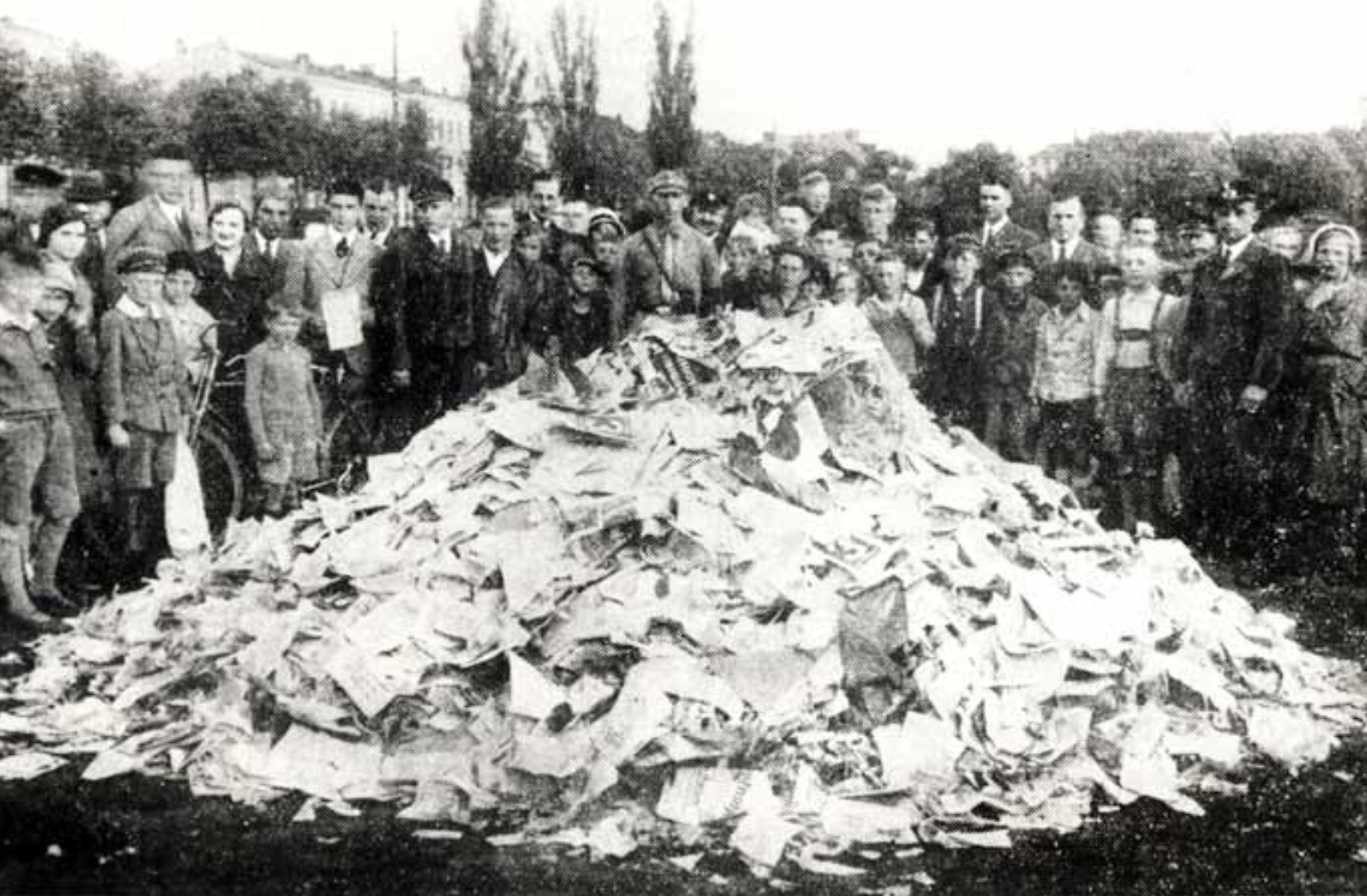 Ebenfalls im Mai 1933 fand auch in Rostock die von der Deutschen Studentenschaft organisierte Bücherverbrennung statt. Offizieller Titel der Kundgebung war „Wider den undeutschen Geist“. Nach einem Fackelzug der Rostocker Korporationen mit ihren Chargierten (!) durch die Hauptstraßen Rostocks am 8. Mai 1933 wurde vor dem Universitäts-Hauptgebäude ein sog. „Schandpfahl“ errichtet, an den verschiedene Schriften jüdischer oder anderweitig verfemter Autoren angenagelt wurden (seit 2003 steht an derselben Stelle ein Mahnmal). Am Folgetag wurden dann die Universitätsbibliotheken nach weiterer unliebsamer Literatur durchsucht. Diese wurde am 10. Mai in einer Aktion auf dem Vögenteichsplatz öffentlich verbrannt. In der Mecklenburger Zeitung wird diese Aktion nicht erwähnt. Aus einem Rundschreiben der Turnerschaft Baltia wissen wir aber, daß alle Rostocker Korporationen dabei waren, also wird das auch für Mecklenburgia gegolten haben.