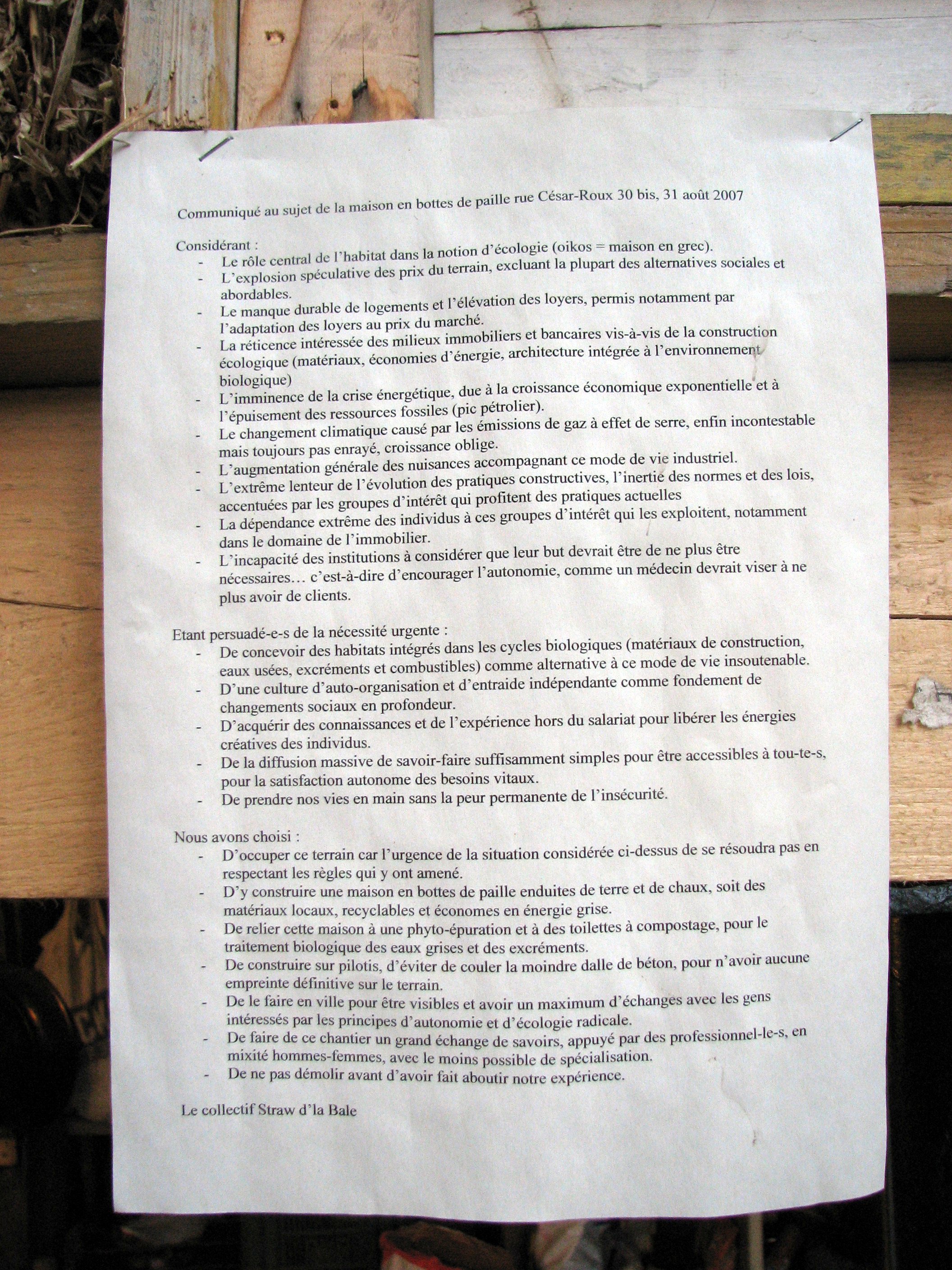 In Lausanne am Genfer See haben AktivistInnen unterhalb des Autonomen Zentrums ein Strohhaus vollständig aus ökologischen Baumaterialien gebaut (Fotos: 1 2 3 4). Von der Stadtverwaltung wurde ein Ultimatum für den Abriss des Hauses gestellt, wogegen es am 6. November eine Kundgebung vor dem Gemeinderat gibt.