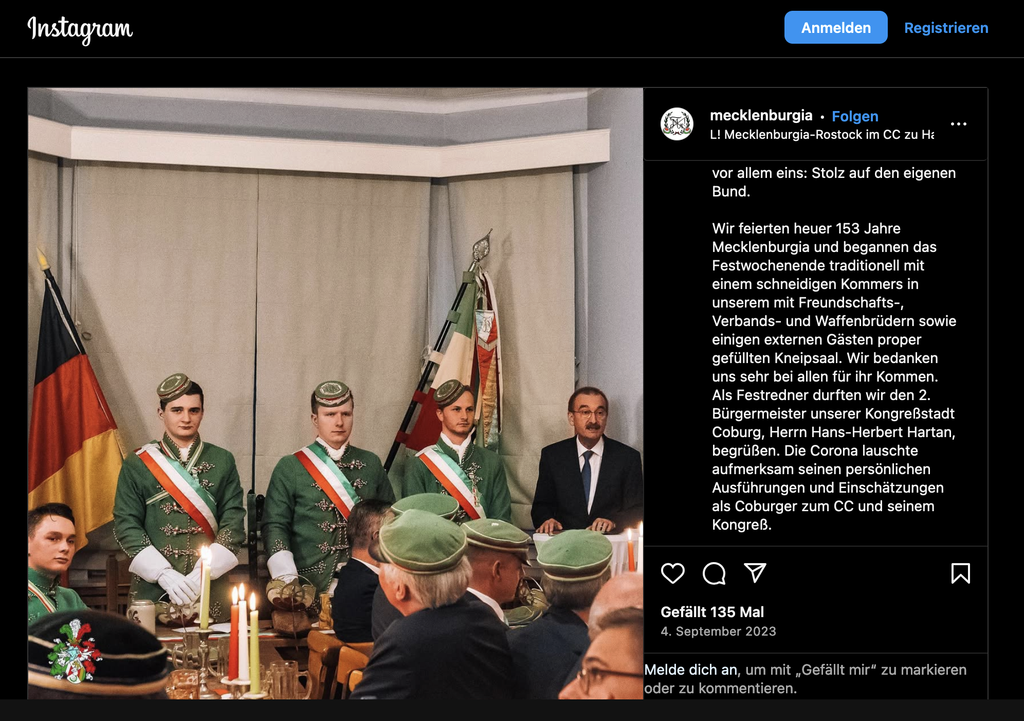 „Wir feierten heuer 153 Jahre Mecklenburgia und begannen das Festwochenende traditionell mit einem schneidigen Kommers in unserem mit Freundschafts-, Verbands- und Waffenbrüdern sowie einigen externen Gästen proper gefüllten Kneipsaal. Wir bedanken uns sehr bei allen für ihr Kommen. Als Festredner durften wir den 2. Bürgermeister unserer Kongreßstadt Coburg, Herrn Hans-Herbert Hartan, begrüßen. Die Corona lauschte aufmerksam seinen persönlichen Ausführungen und Einschätzungen als Coburger zum CC und seinem Kongreß.“