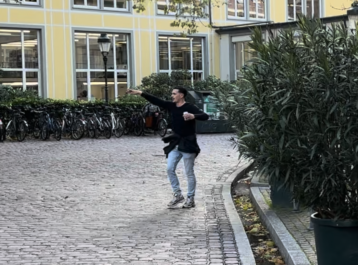 „Einer dieser Männer mit gelbem ,Ordner‘-Band ist besonders auffällig: Er trägt einen Pullover mit der Aufschrift ,The white Race‘ [...] In der Vergangenheit veröffentlichte er unter anderem ein Foto, das ihn in einem Shirt mit dem Aufdruck ,Blood and Honour‘ und einem SS-Totenkopf zeigt. [...] Unter dem geposteten Bildmaterial des Mannes befinden sich zudem Symboliken der als rechtsextremistisch eingestuften Partei ,Der Dritte Weg‘ sowie so genannte Memes mit Bezügen zur NS-Zeit - etwa ein Bild, das Adolf Hitler schlafend in einer Hängematte zeigt. In einem weiteren Meme fordert ein Wehrmachtssoldat einen Anhänger der LGBTQ-Bewegung, die in rechtsextremen Kreisen als Feindbild gilt, dazu auf, Gas einzuatmen.“