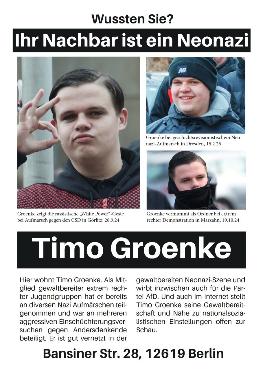 Im April 2025 wurden in Berlin Mitglieder der militanten Nazigruppe „Deutsche Jugend Voran“ geoutet: Anthony Jähne in der Grevesmühlener Straße 10 in Hohenschönhausen, Timo Groenke in der Bansiner Straße 28 in Hellersdorf und Aron Reimers in der Müggelheimer Straße 55 in Köpenick.