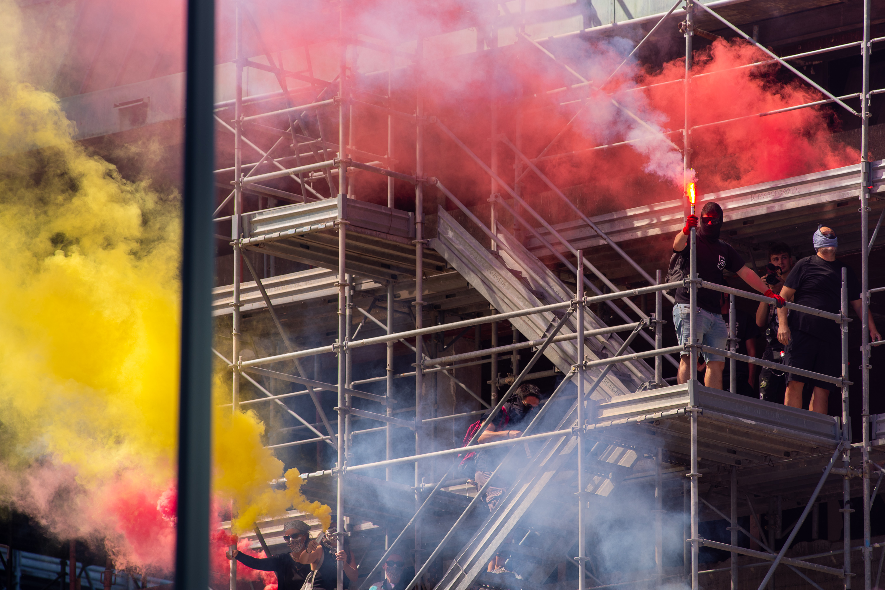 Später gab es einen weiteren Bannerdrop mit dem Motto „Giù le mani dagli spazi sociali“ („Hände weg von den sozialen Räumen“). Bei bestem Wetter wurden mehrfach Feuerwerk und viele bunte Rauchtöpfe gezündet: „Potranno tagliare tutti i fiori, ma non fermeranno mai la primavera.“ („Sie können alle Blumen abschneiden, aber sie werden den Frühling nie aufhalten.“)